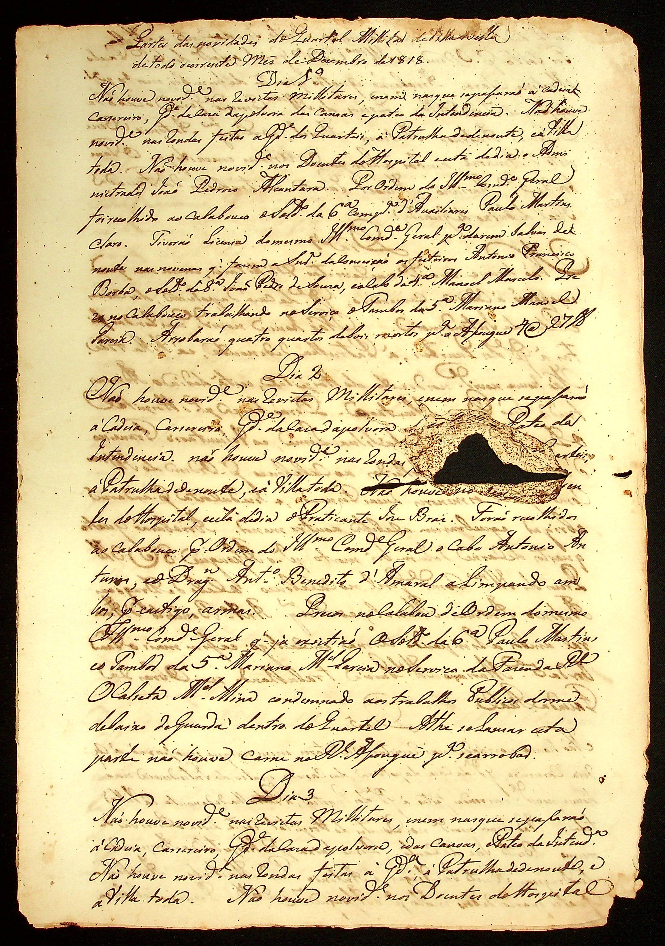 MEMORIAL da participação das novidades do Quartel Militar de Vila Bela dos meses de Novembro a Dezembro, assinado pelo Comandante Manoel Rebelo Leite.