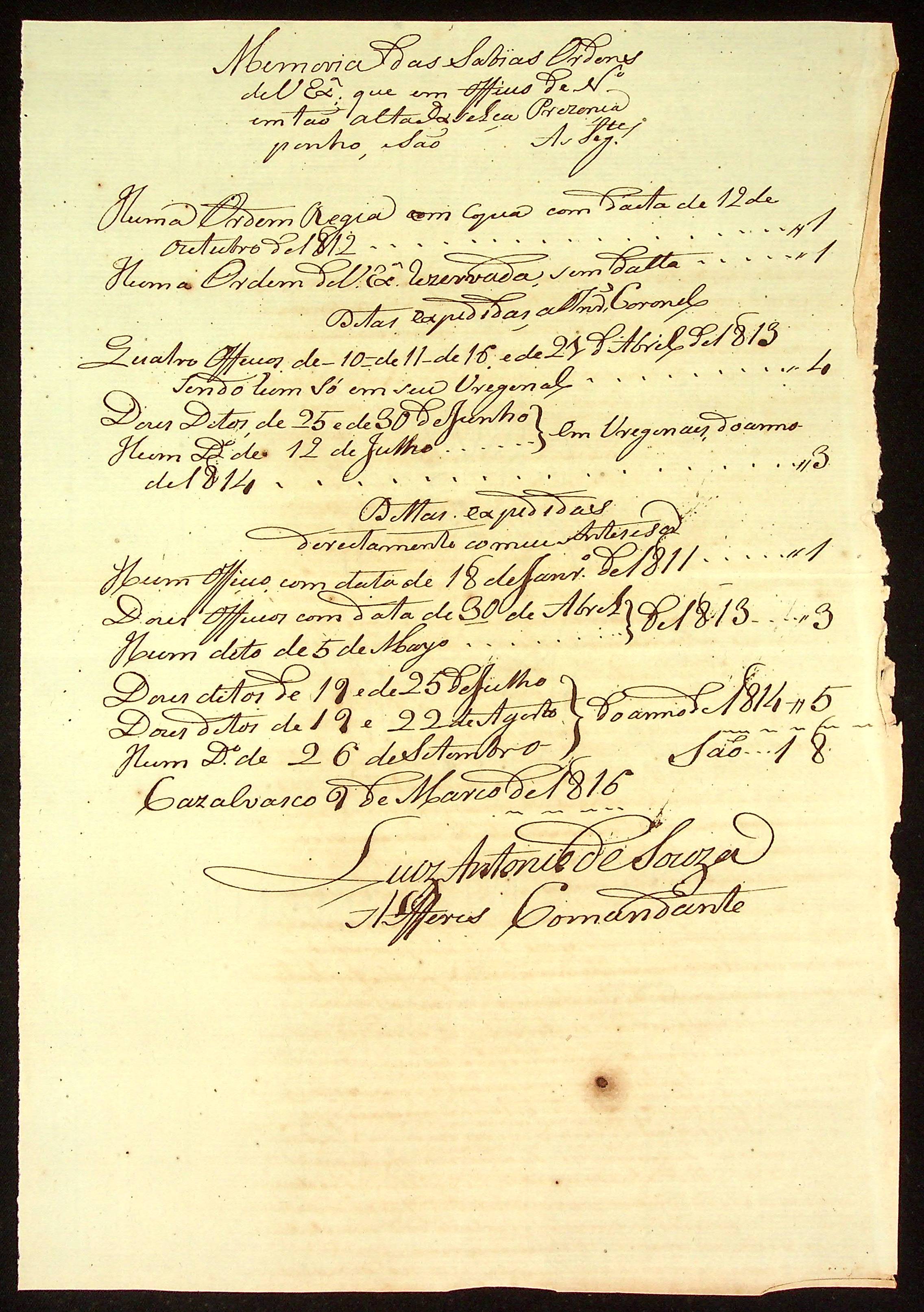 MEMÓRIA escrita pelo Alferes Comandante Luís Antônio de Souza sobre as sábias ordens do [Governador e Capitão-General da Capitania de Mato Grosso João Carlos Augusto d’Oeynhausen e Gravenberg].