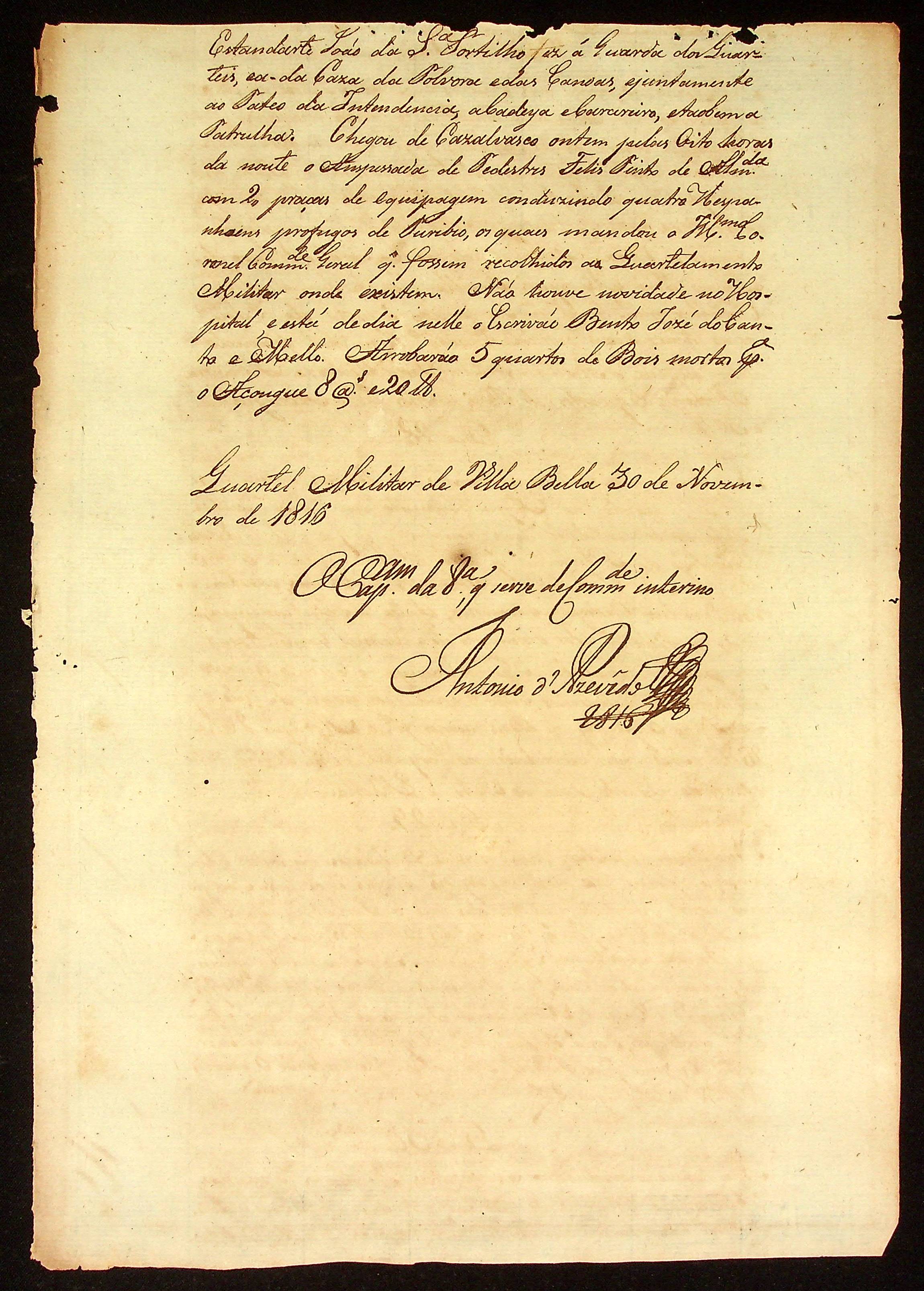 MEMÓRIA das novidades acontecidas diariamente no Quartel Militar de Vila Bela assinadas pelo Comandante Manoel Rebelo Leite.