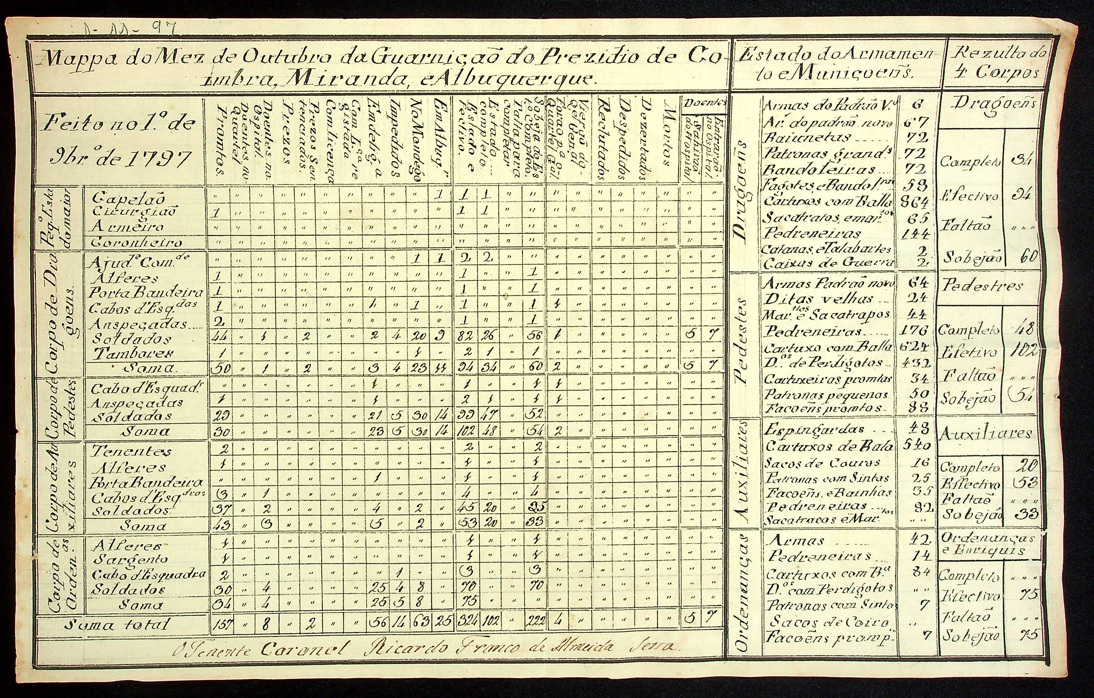MAPA do mês de Outubro da Guarnição do Presídio de Coimbra, Miranda e Albuquerque, expedido pelo Tenente-Coronel Ricardo Franco de Almeida Serra.