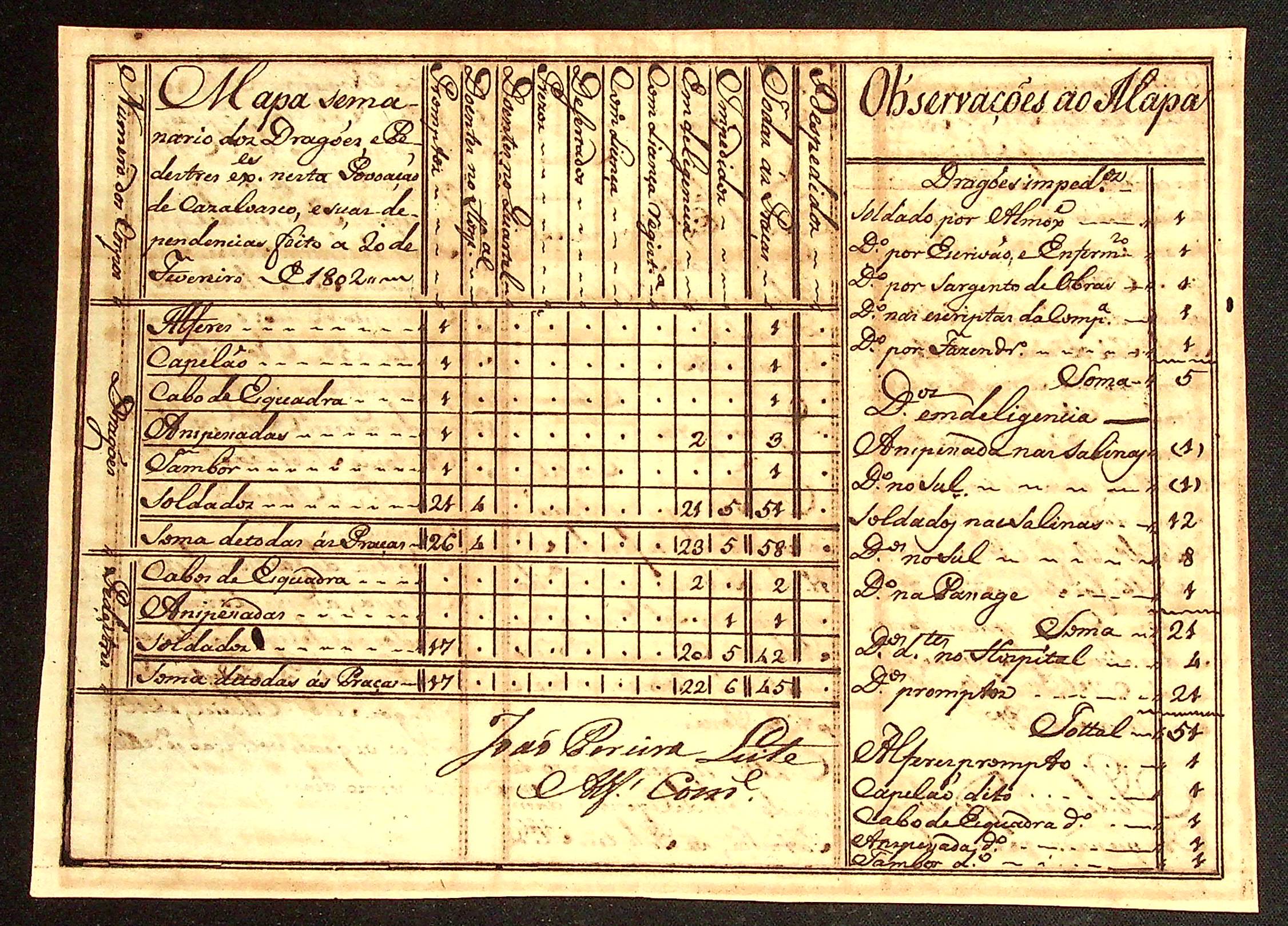 MAPA Semanário dos Dragões e Pedestres existentes na Povoação de Casalvasco assinado pelo Alferes Comandante João Pereira Leite.
