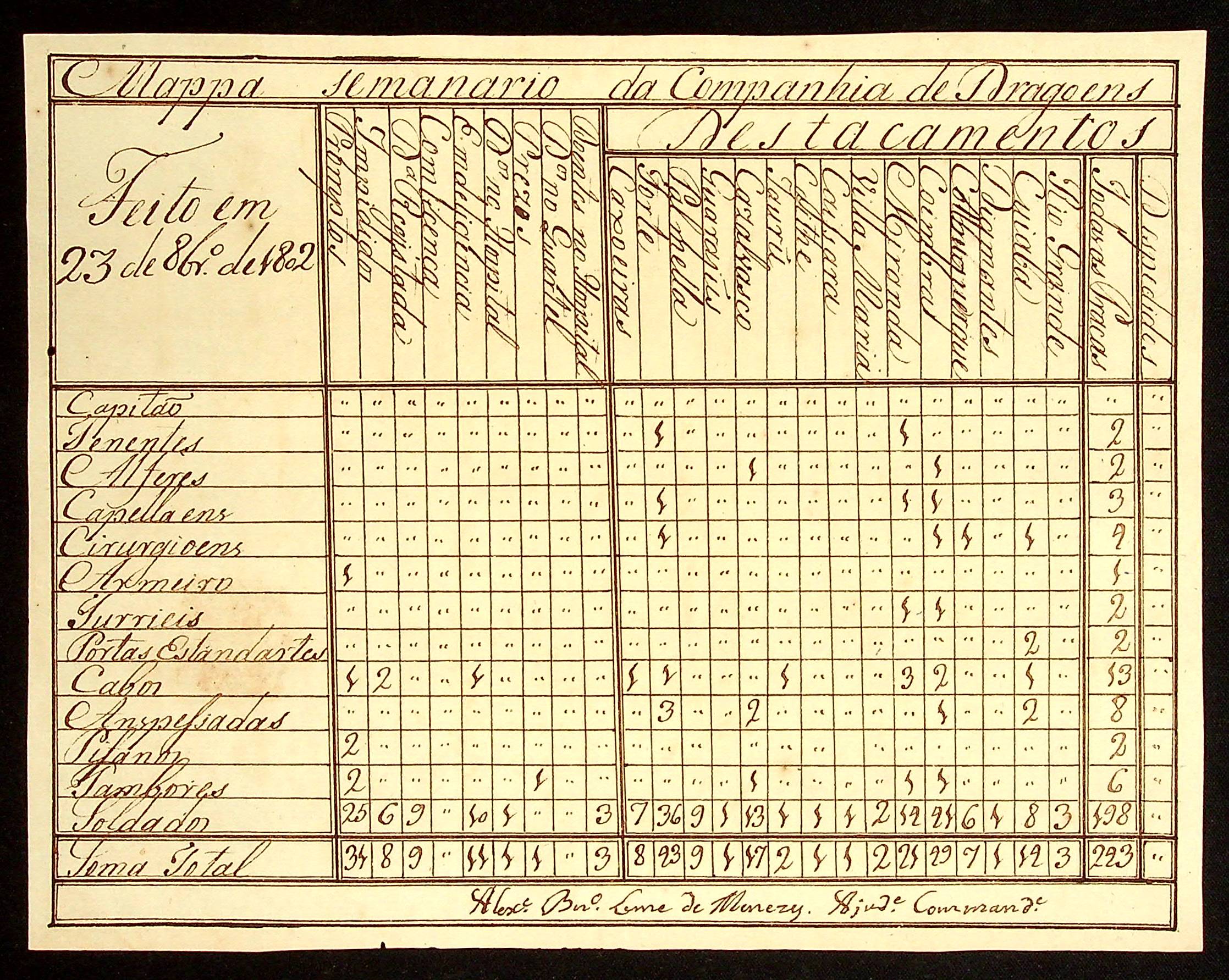 MAPA Semanário da Companhia de Dragões assinado pelo Ajudante de Comandante Alexandre B[…] Leme de Menezes.