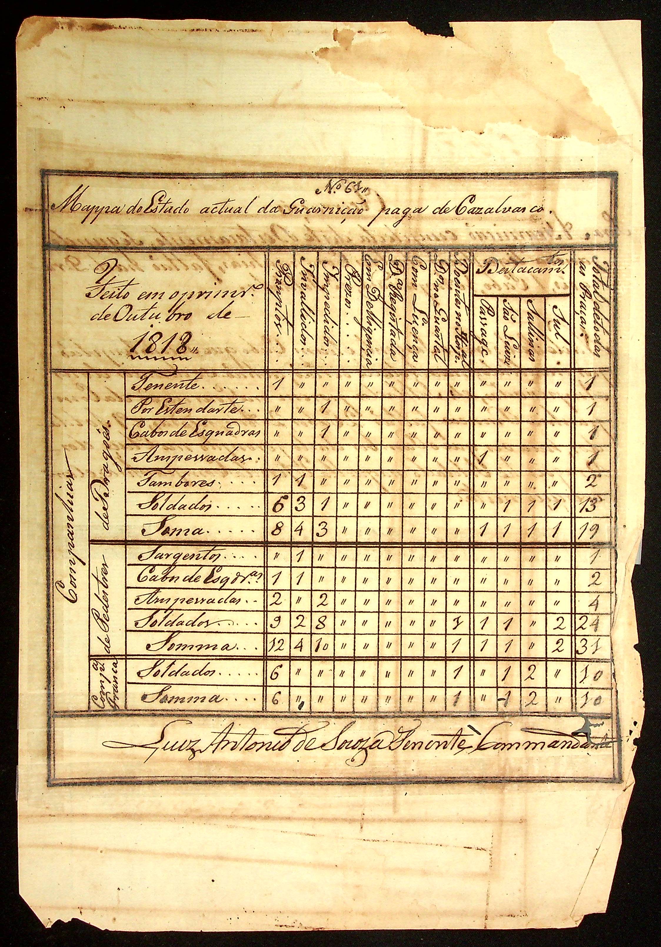 MAPA dos estados atuais da guarnição paga em Casalvasco, assinado pelo Tenente-Coronel Luiz Antônio de Souza.