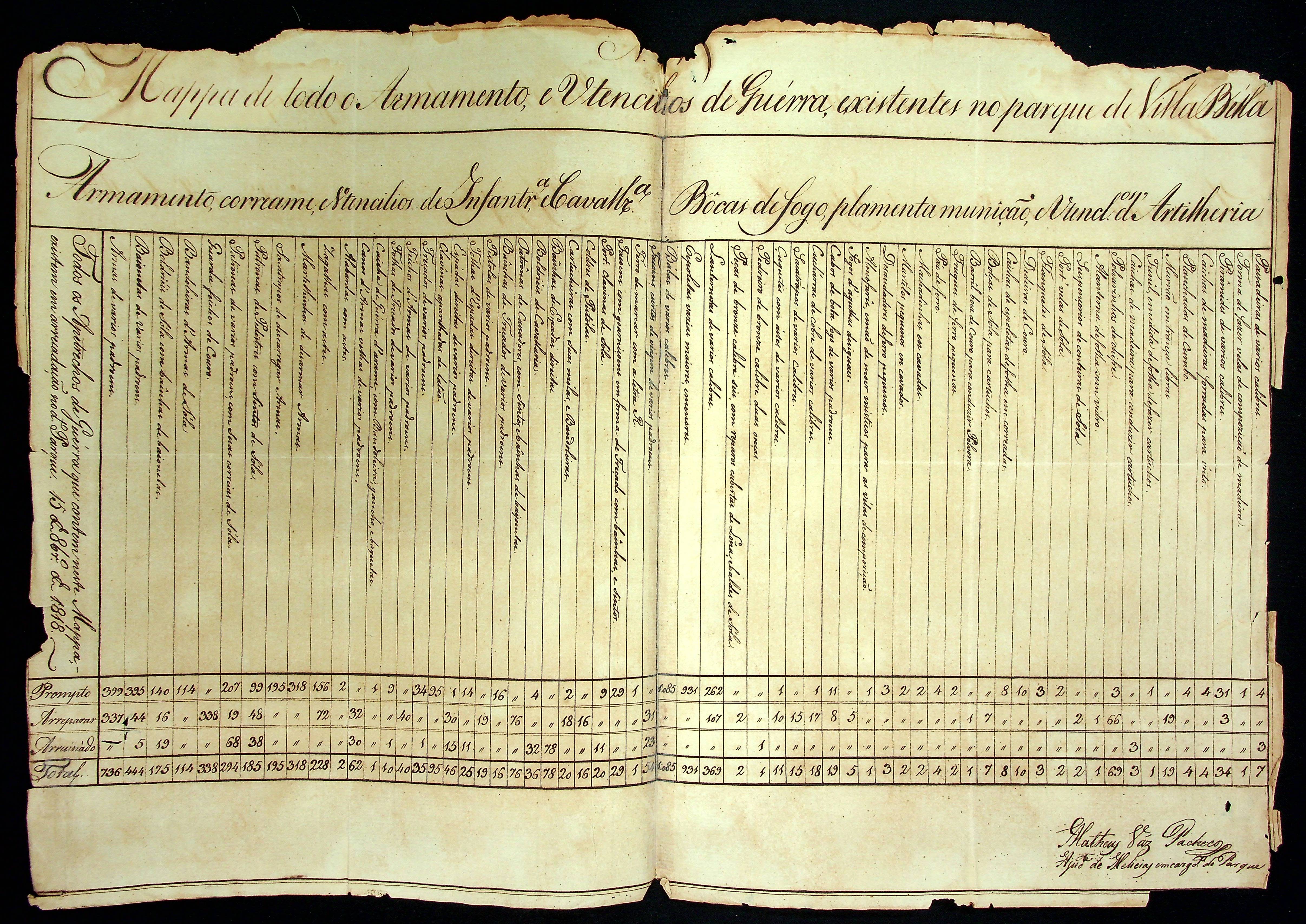 MAPA do armamento e utensílios de Guerra existentes no parque de Vila Bela, assinado pelo Ajudante de Milícias Matheus Vaz Pacheco.