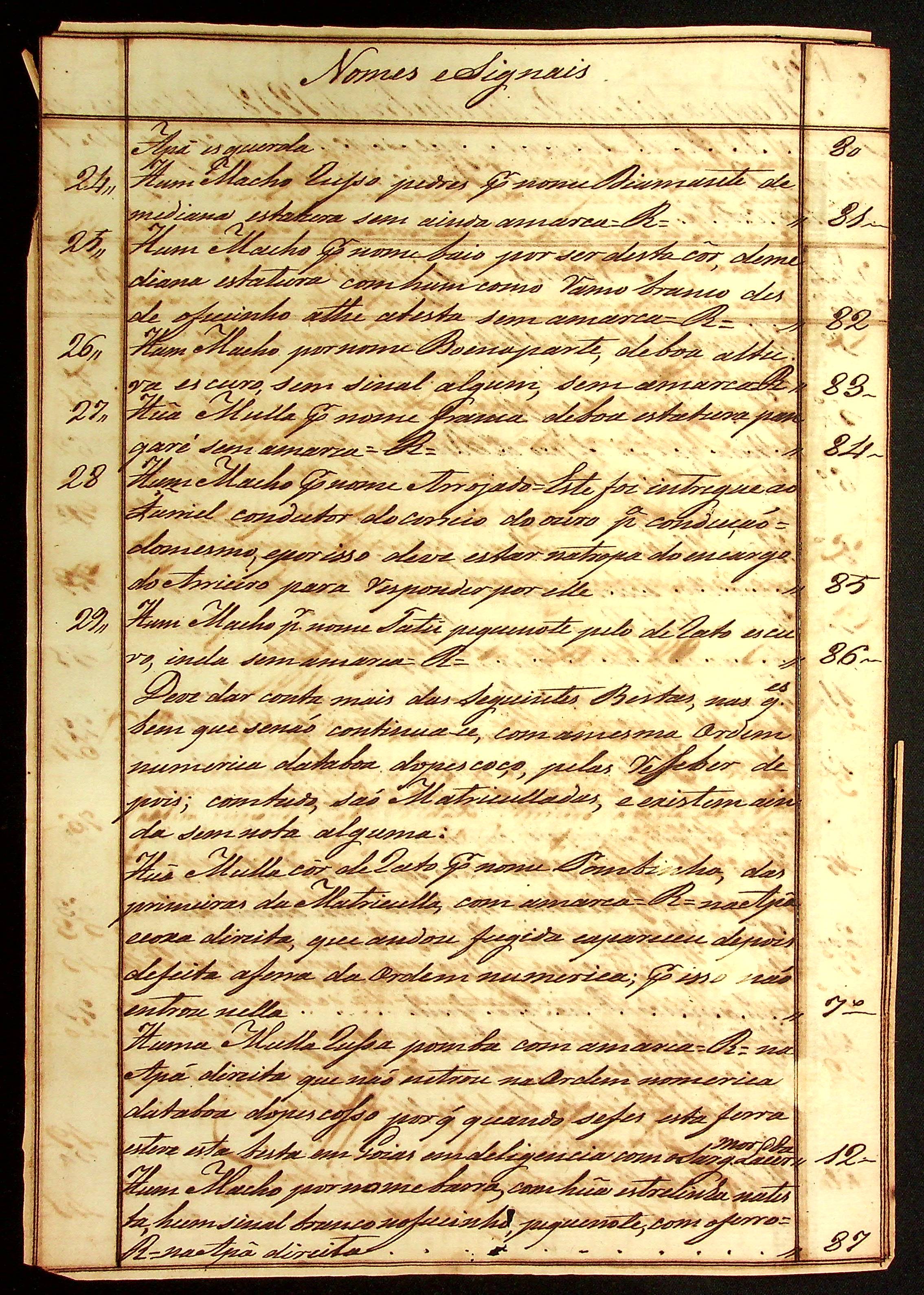 MAPA de todas as bestas da Real Fazenda que se acham a cargo do arrieiro, o Dragão Manoel Francisco Pacheco assinada pelo inspetor Manoel Rebelo Leite.
