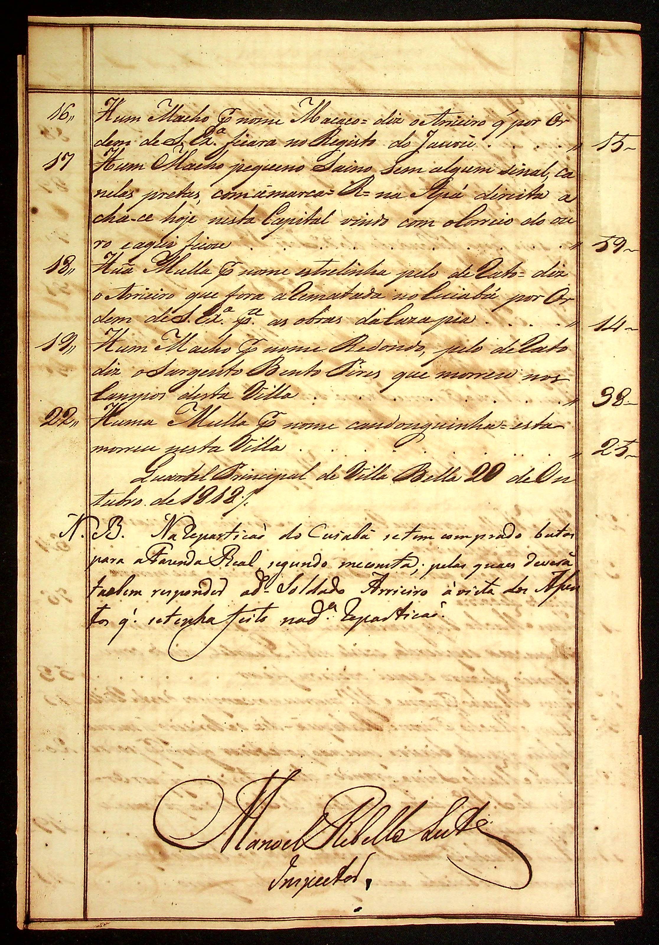 MAPA de todas as bestas da Real Fazenda que se acham a cargo do arrieiro, o Dragão Manoel Francisco Pacheco assinada pelo inspetor Manoel Rebelo Leite.
