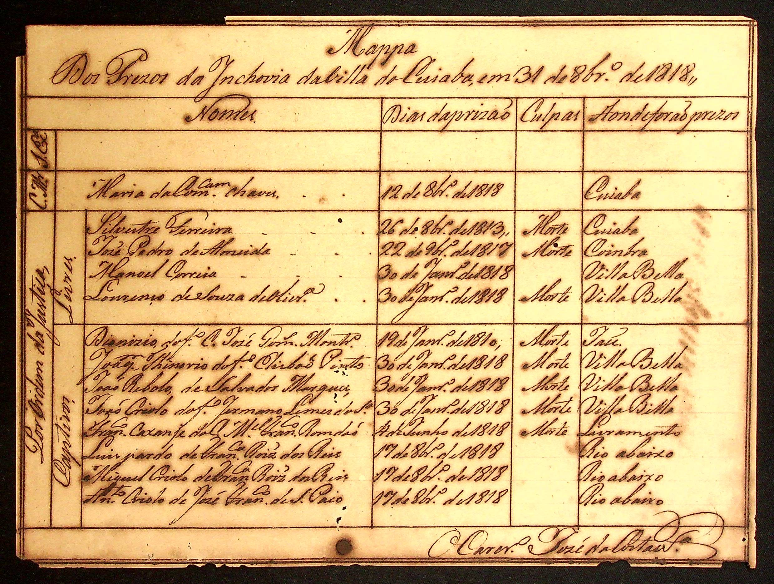 MAPA dos presos da enxovia da Vila do Cuiabá assinada pelo carcereiro José da Costa Silva.