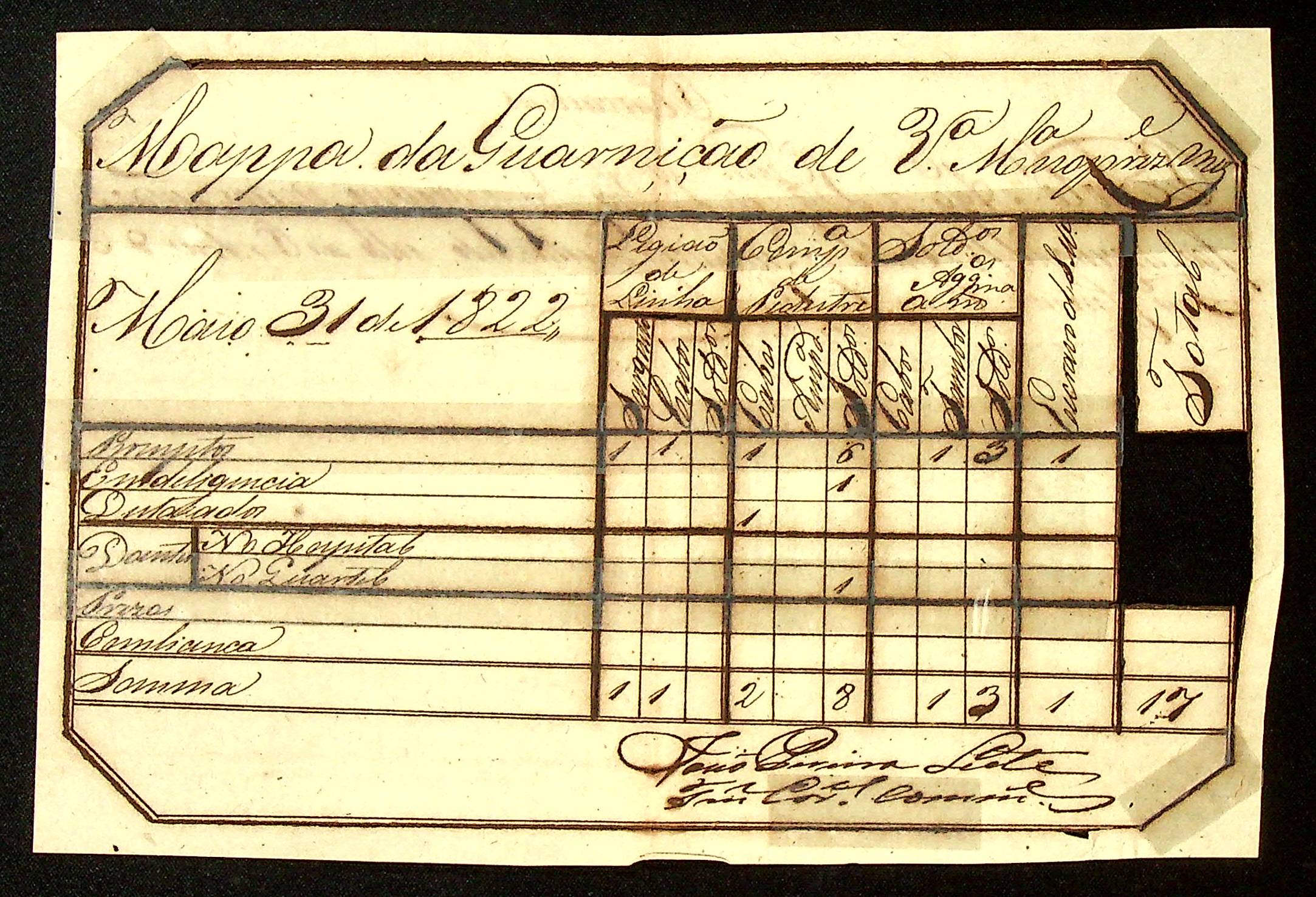 MAPA da Guarnição de Vila Maria assinado pelo Tenente-Coronel Comandante João Pereira Leite.
