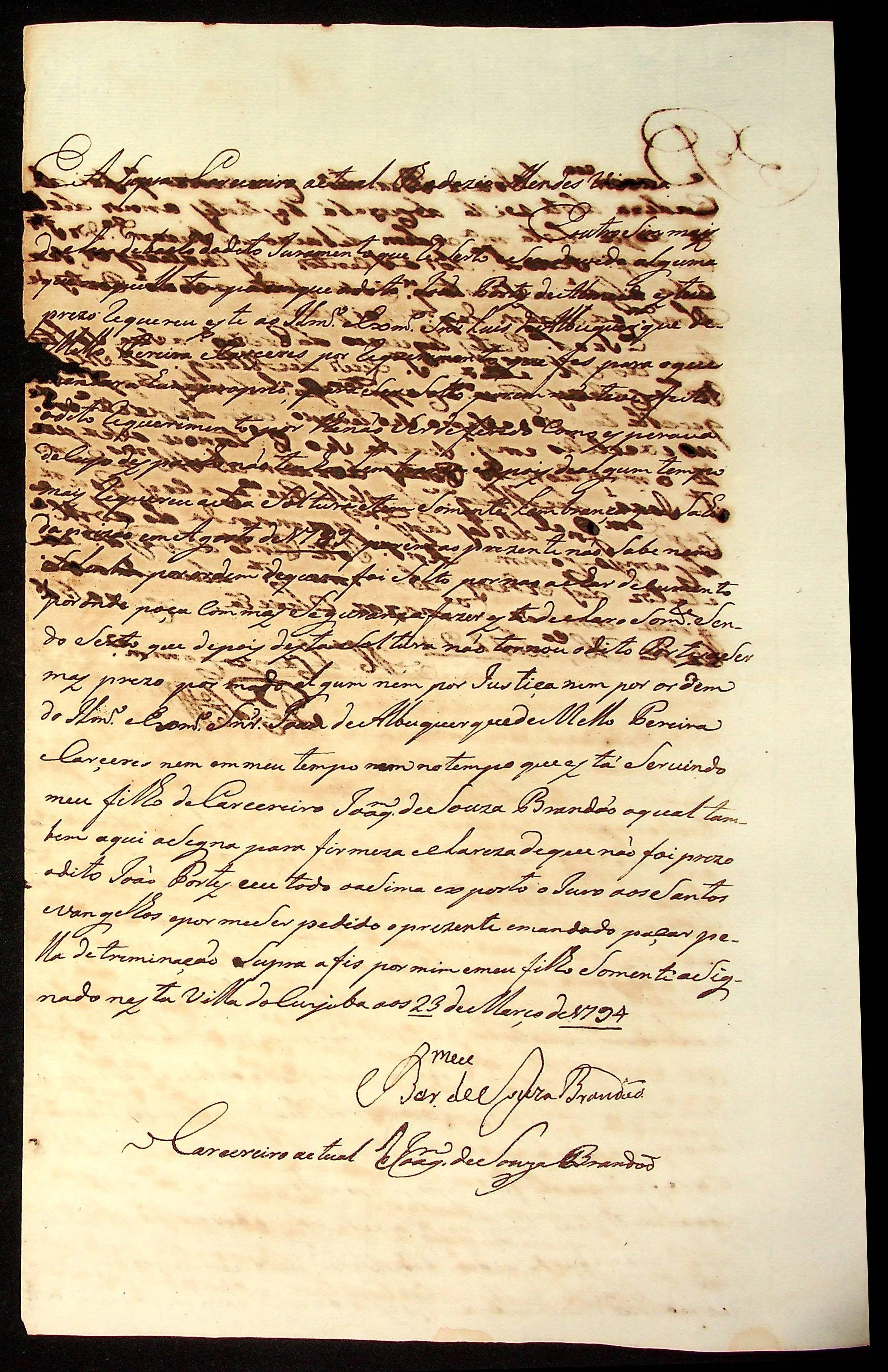 NOTIFICAÇÃO do [Mestre de Campo] Antônio José Pinto de Figueiredo ao Carcereiro Bartolomeu de Souza Brandão.