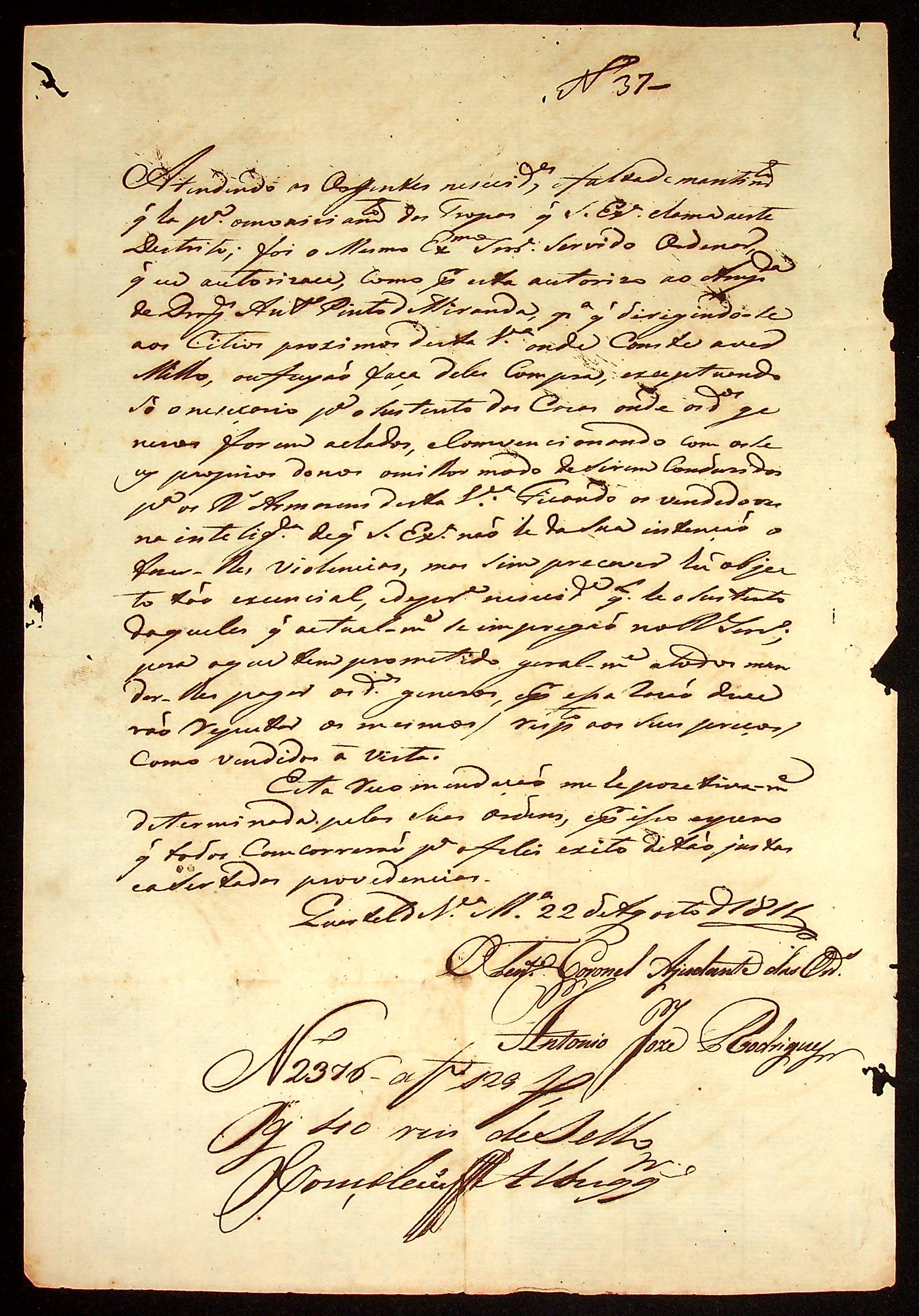 ORDEM expedida pelo Tenente-Coronel Antônio José Rodrigues ao Anspeçada de Dragões Antônio Pinto de Miranda.