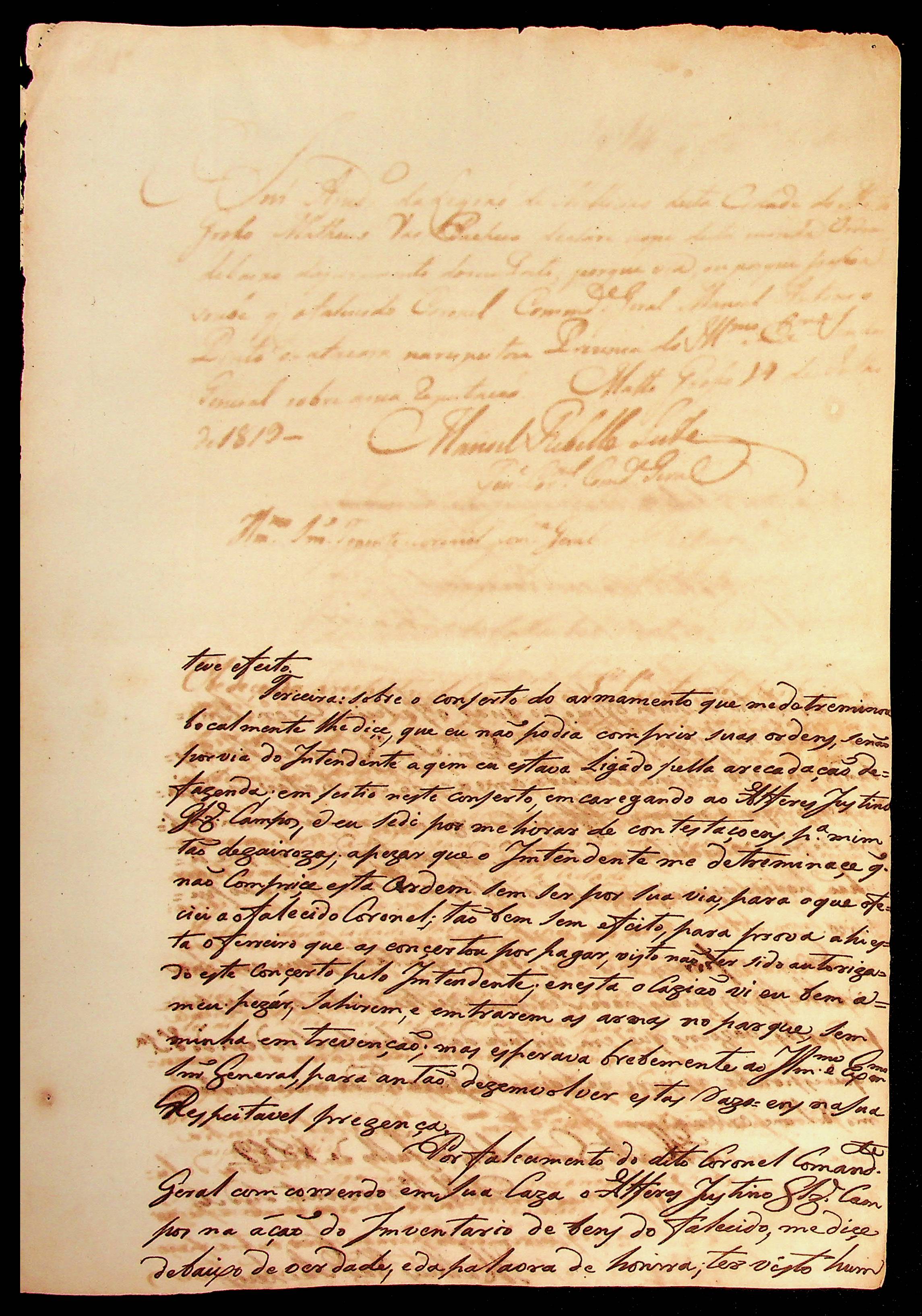 ORDEM do Tenente-Coronel Comandante Geral Manoel [Rabelo] Leite ao Ajudante da Legião de Milícias Matheus Vaz Pacheco.