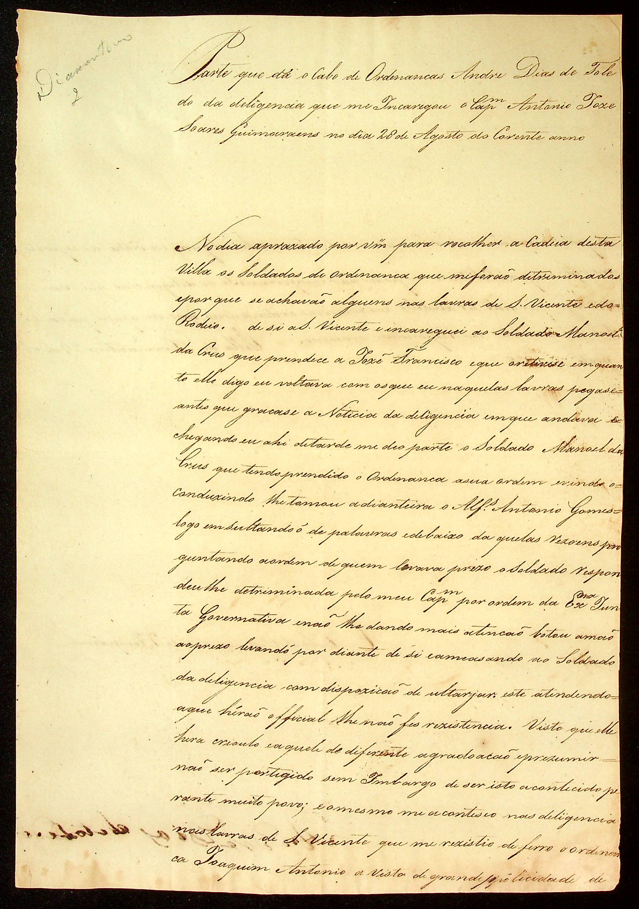 RELATÓRIO da parte que da o Cabo da Ordenança da 7ª Companhia André Dias de Toledo da Diligência que o encarregou o Capitão Antônio José Soares Guimarães.