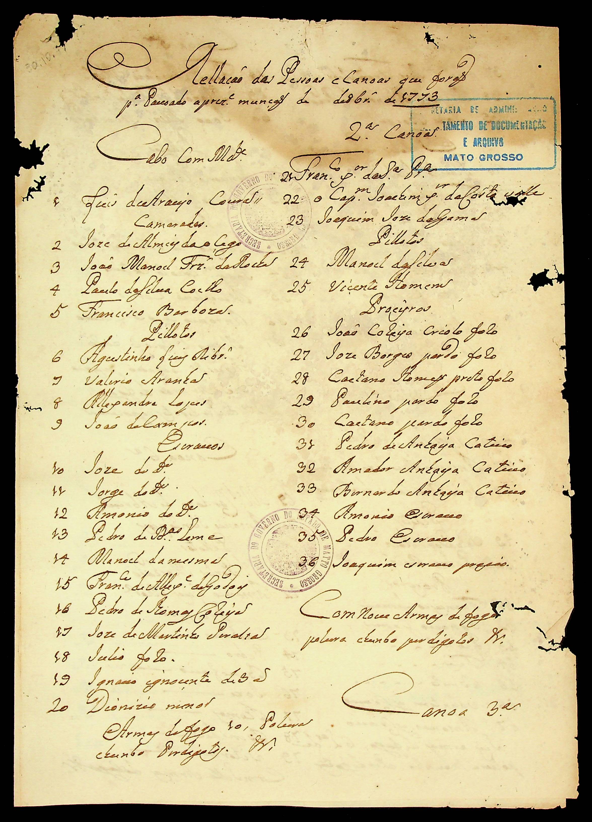 RELAÇÃO das pessoas e canoas que foram ao [povoado] na presente monção feita pelo Mestre da Campo Francisco Lopes de Araújo.