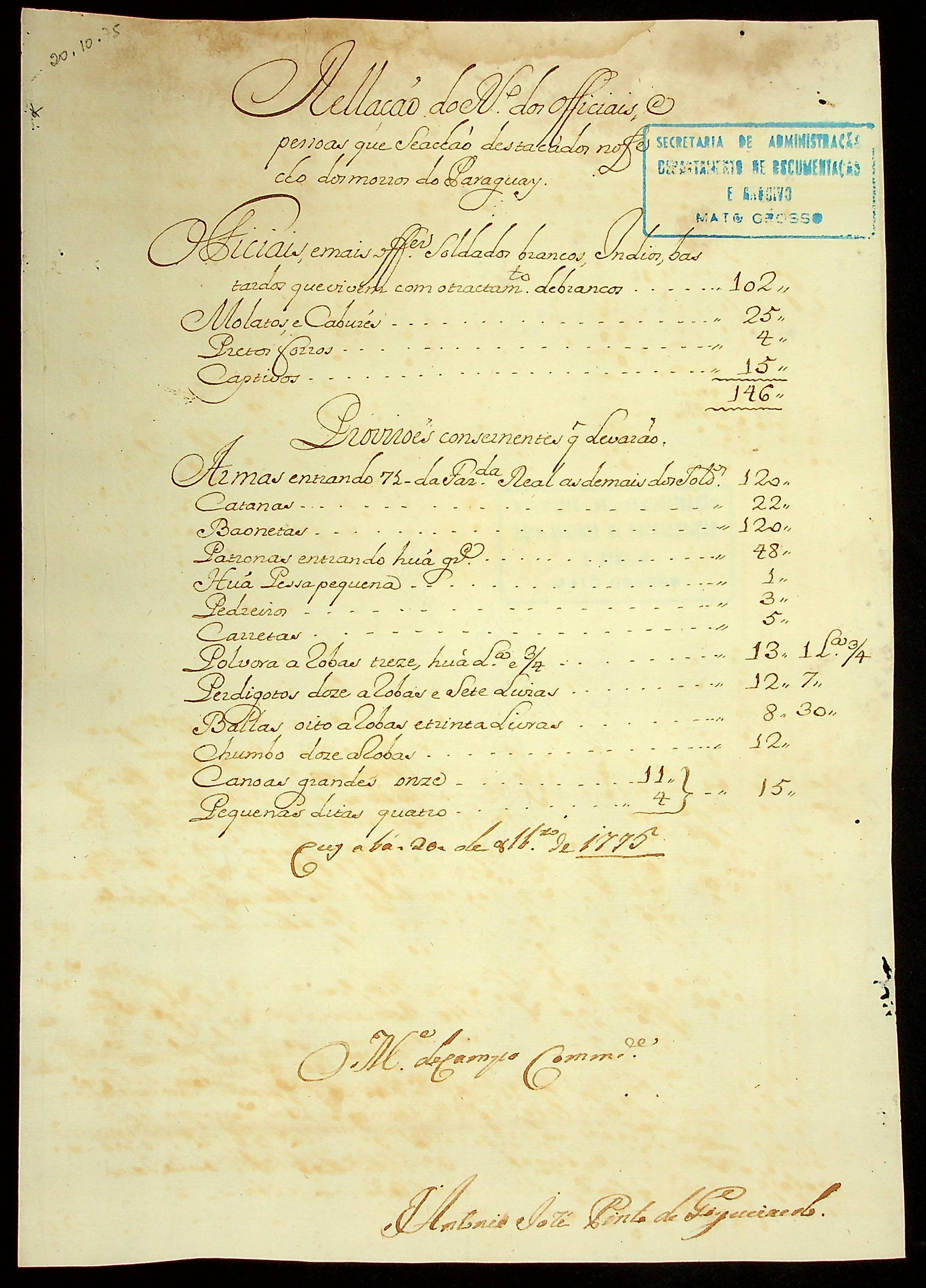 RELAÇÃO dos oficiais e pessoas que se acham destacados no Fecho dos Morros do Paraguai feita pelo Mestre de Campo Antônio José Pinto de Figueiredo.