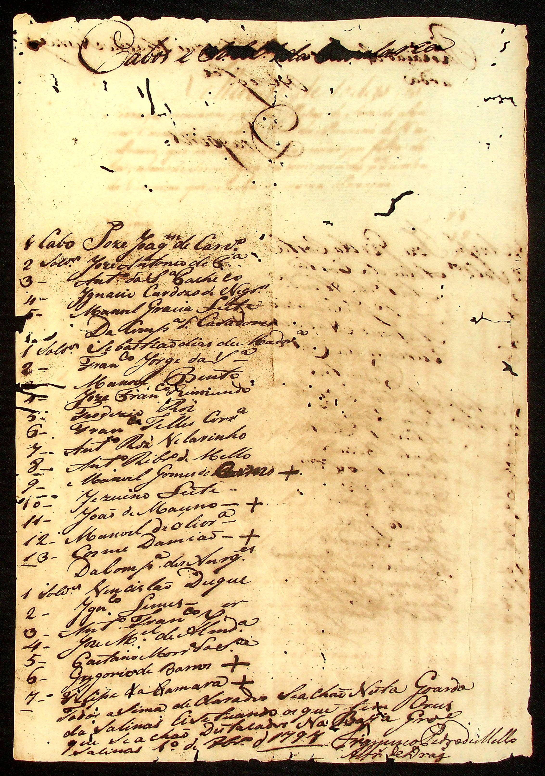 RELAÇÃO dos militares que se encontram nas Rondas de Salinas e na Baía Grande, expedida pelo Alferes de Dragão Francisco Pedro de Melo.