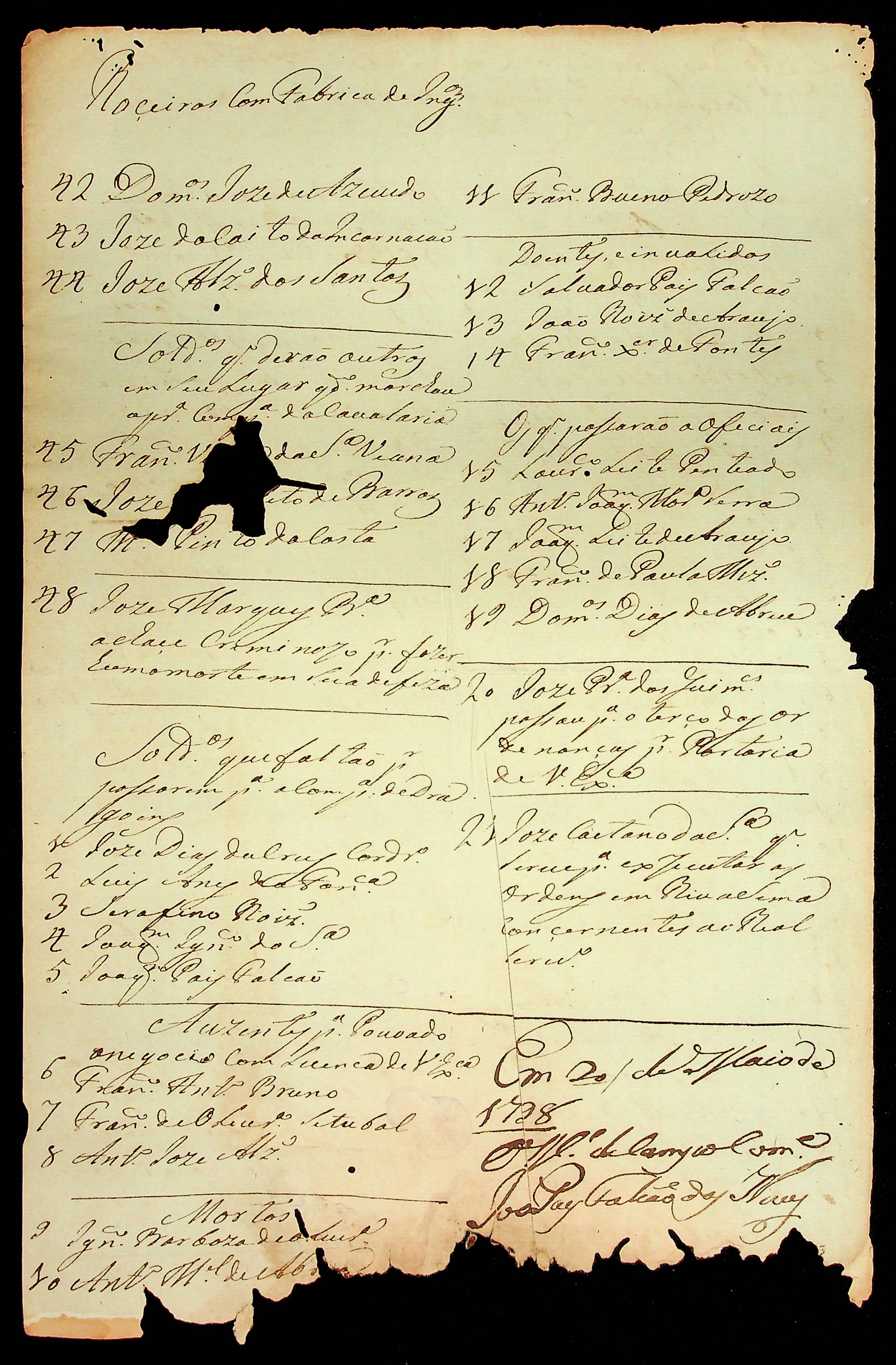 RELAÇÃO das praças da Cavalaria existente nesta Vila do Cuiabá e seus Distritos expedida pelo Mestre de Campo e Comandante José Paes Falcão das Neves.