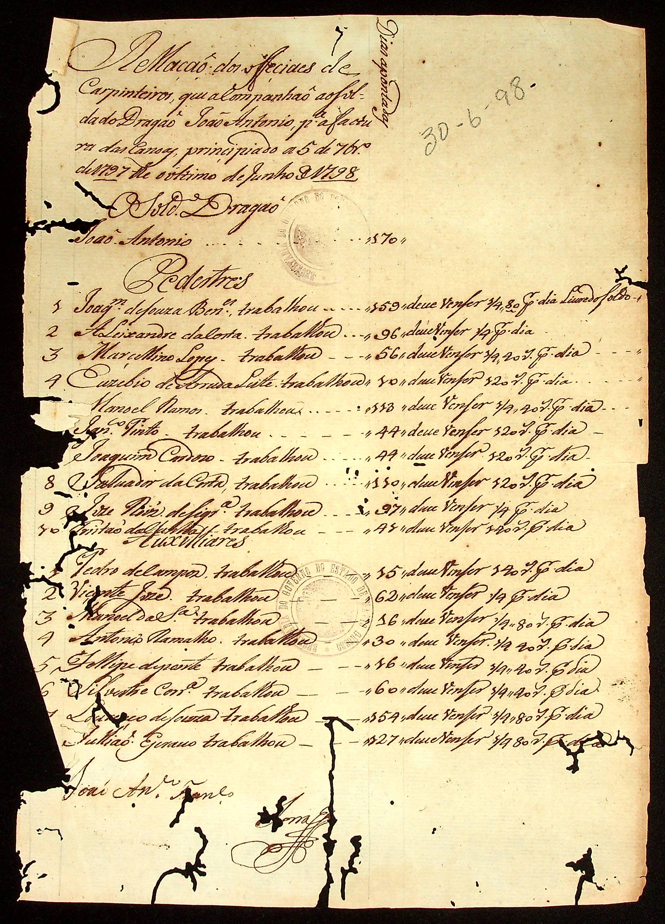 RELAÇÃO dos oficiais carpinteiros que acompanham o Soldado Dragão João Antônio para as facturas das canoas principiado a 5 de setembro de 1797 à último de julho de 1798.