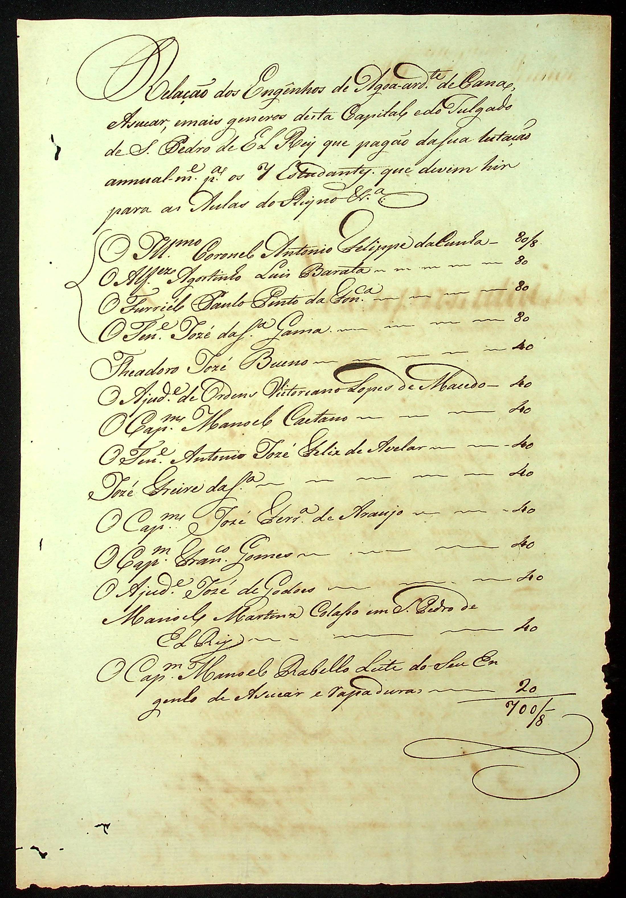 RELACÃO feita pelo Capitão Manoel [Rabelo] Leite dos engenhos de aguardente de cana-de-açúcar e mais gêneros da Capital e do Julgado de São Pedro d’El Rey que pagaram sua contribuição anual para os 7 estudantes que devem ir para as aulas do Reino.