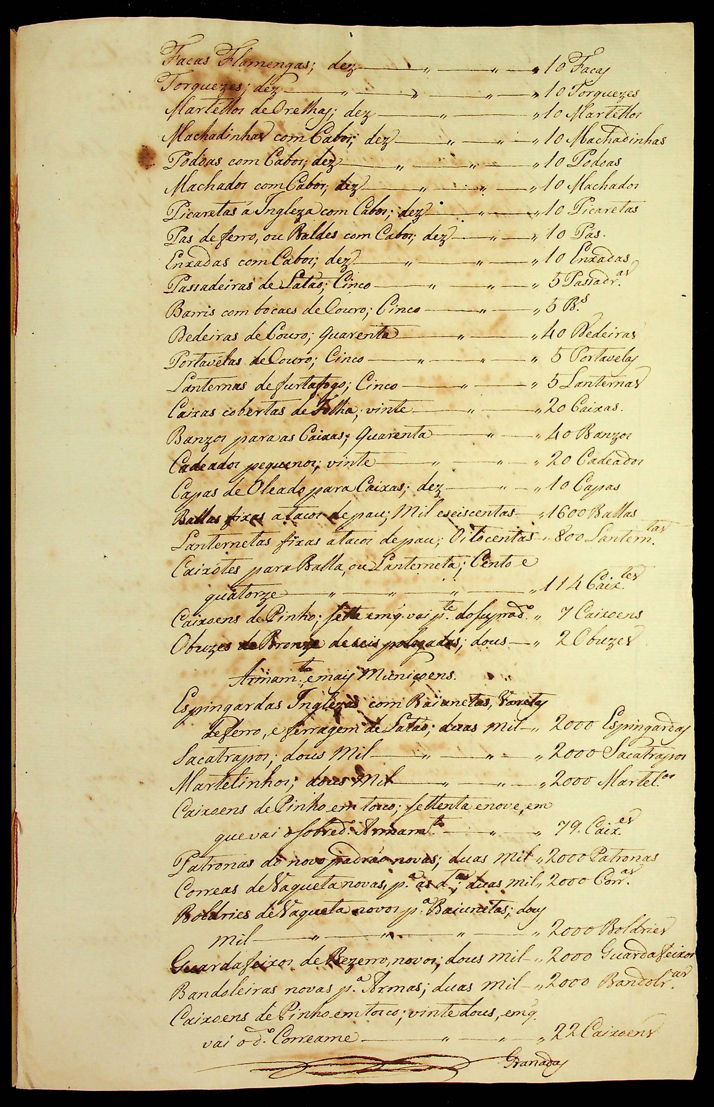 RELAÇÃO de artilharia e gêneros que o Sargento-mor do Real Corpo de Engenheiros Antônio José Rodrigues recebeu do Almoxarife do Arsenal Real do Exército Victorino Antônio Nogueira.