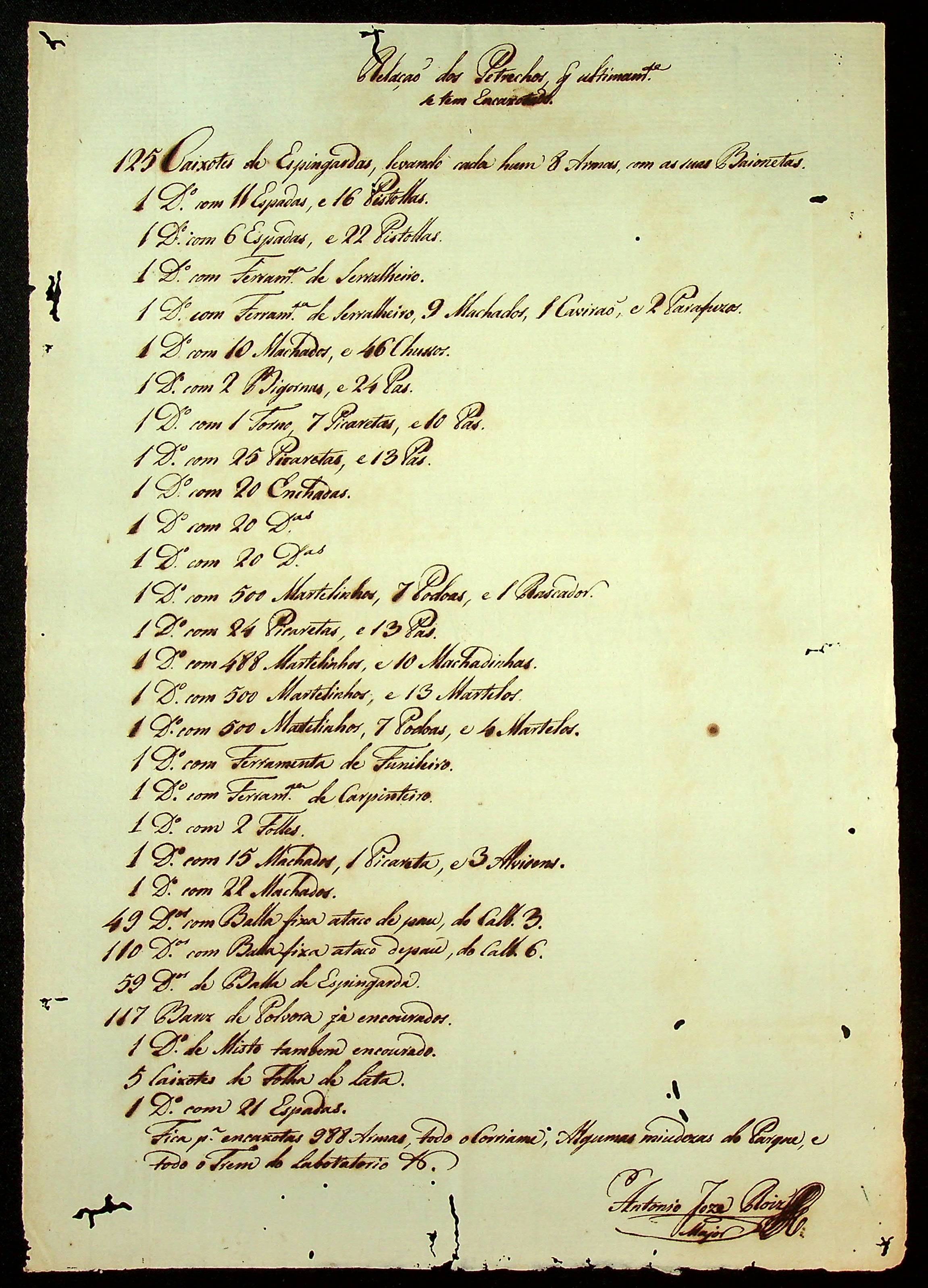 RELAÇÃO dos víveres, munições e mais coisas que se consumiram com a equipagem da Real expedição que conduziu os petrechos de guerra de Porto Feliz para a Vila do Cuiabá, no ano de1804, sendo a dita equipagem composta de 162 Praças entre Tropas e gente trabalhando.