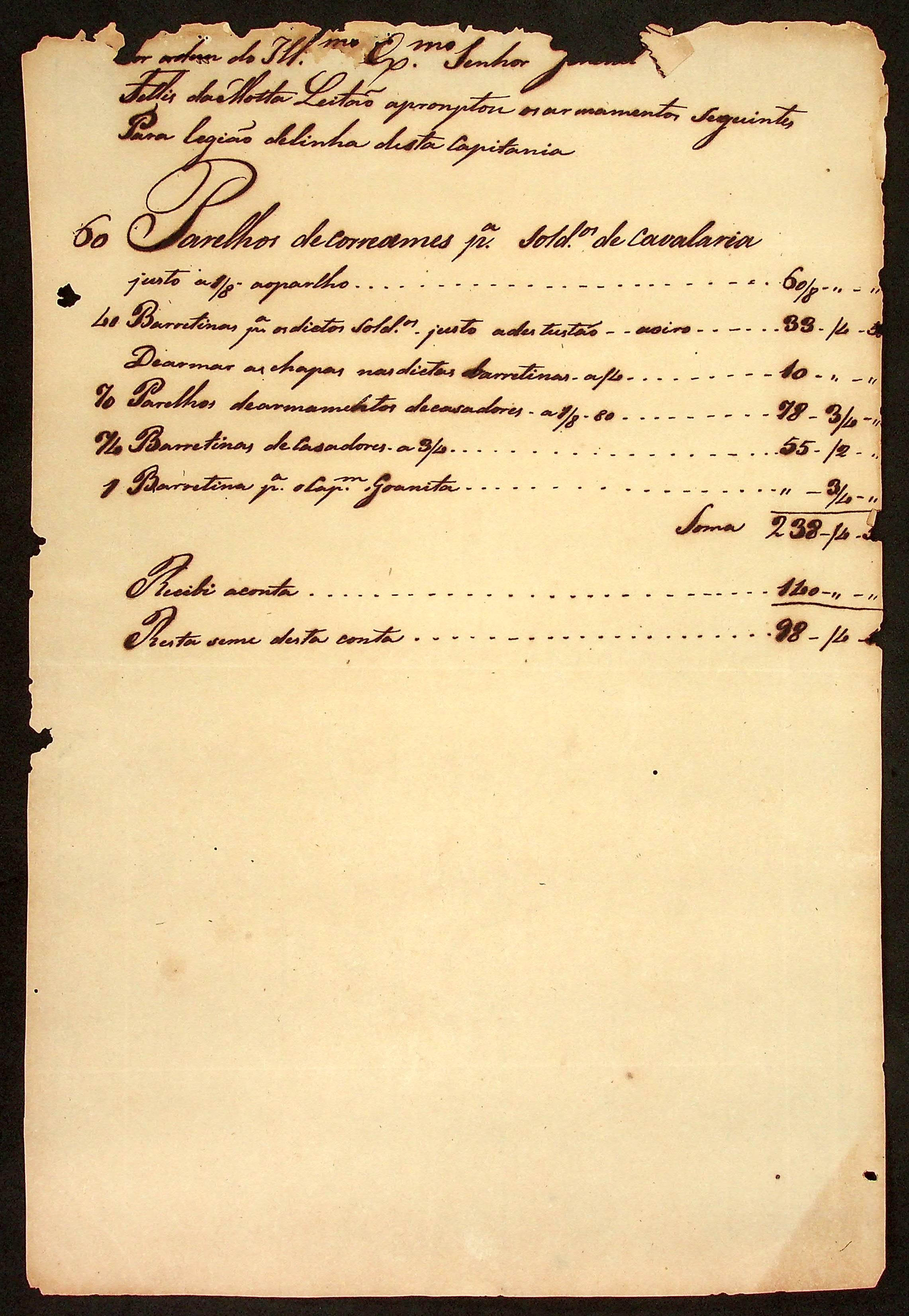 RELAÇÃO dos armamentos produzidos por Félix da Motta Leitão para a Legião de Linha da Capitania.