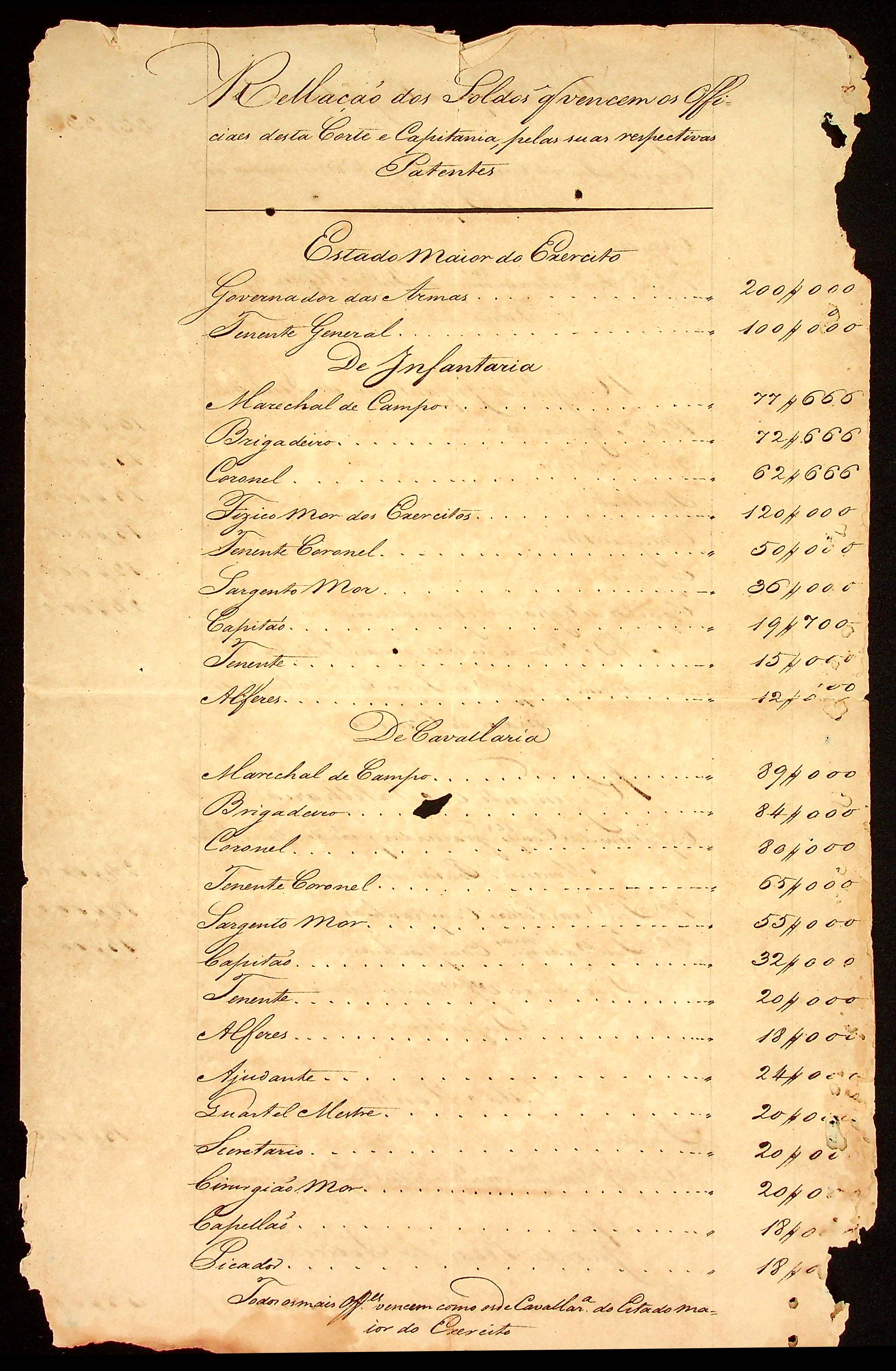 RELAÇÃO dos soldos que vencem os Oficiais desta Corte e Capitania pelas suas respectivas patentes, assinada por João Valentim de Faria Souza Lobato.
