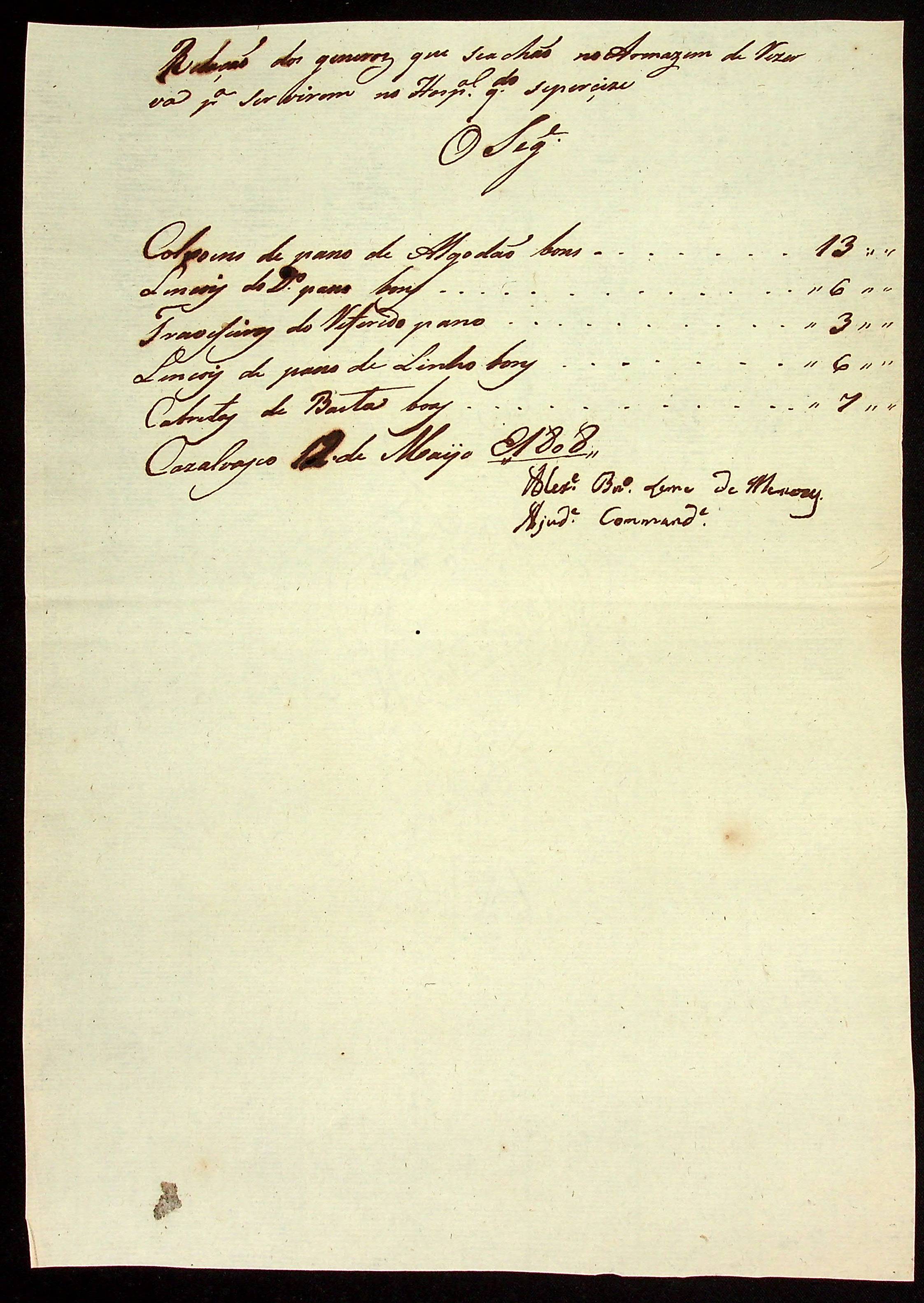 RELAÇÃO dos gêneros que se achavam no Armazém para servirem ao Hospital, assinada pelo Ajudante Comandante Alexandre Brito de Meneses.
