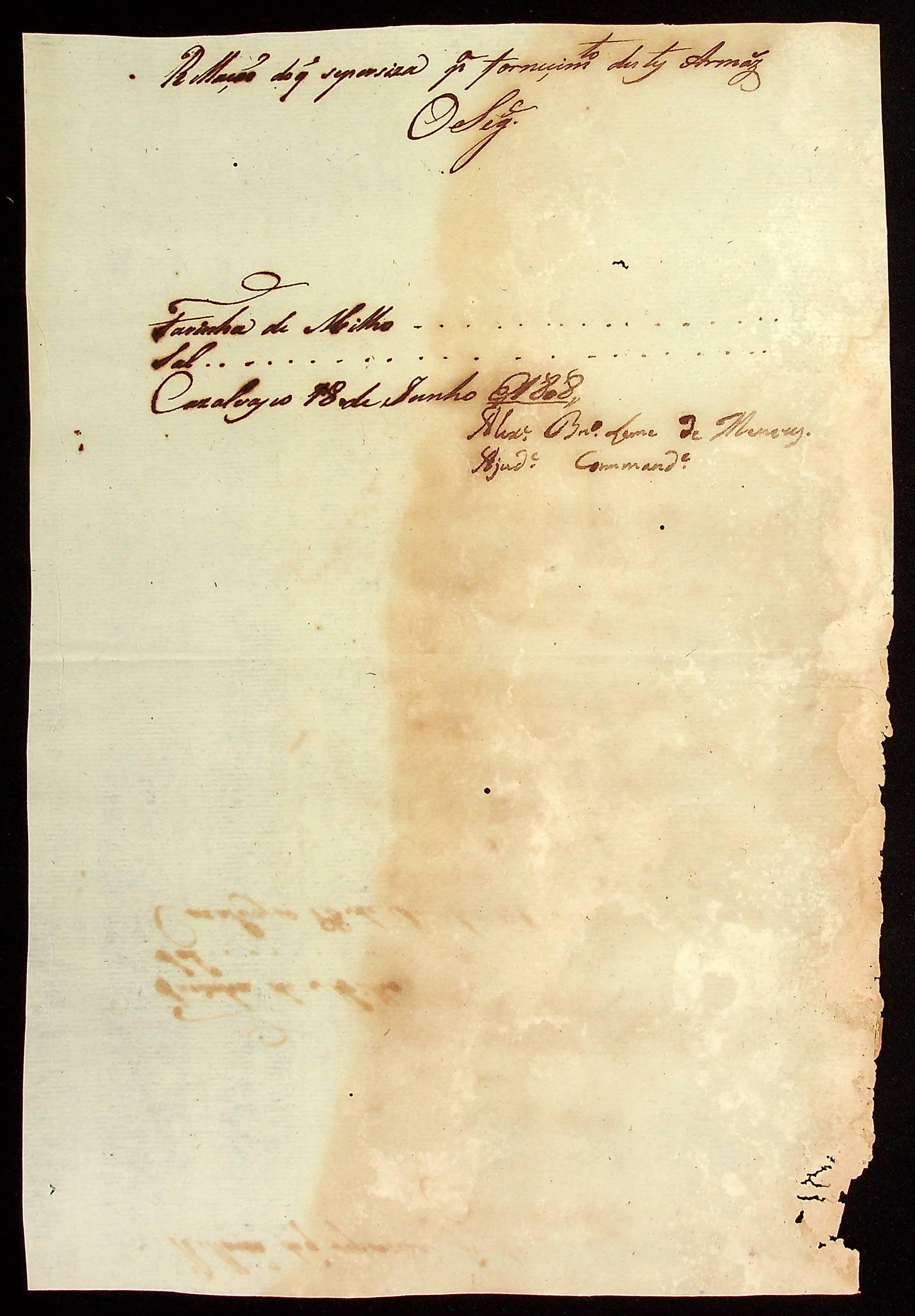 RELAÇÃO do que se precisa no Armazém Real assinado pelo Ajudante e Comandante Alexandre [Brito] Leme de Meneses.