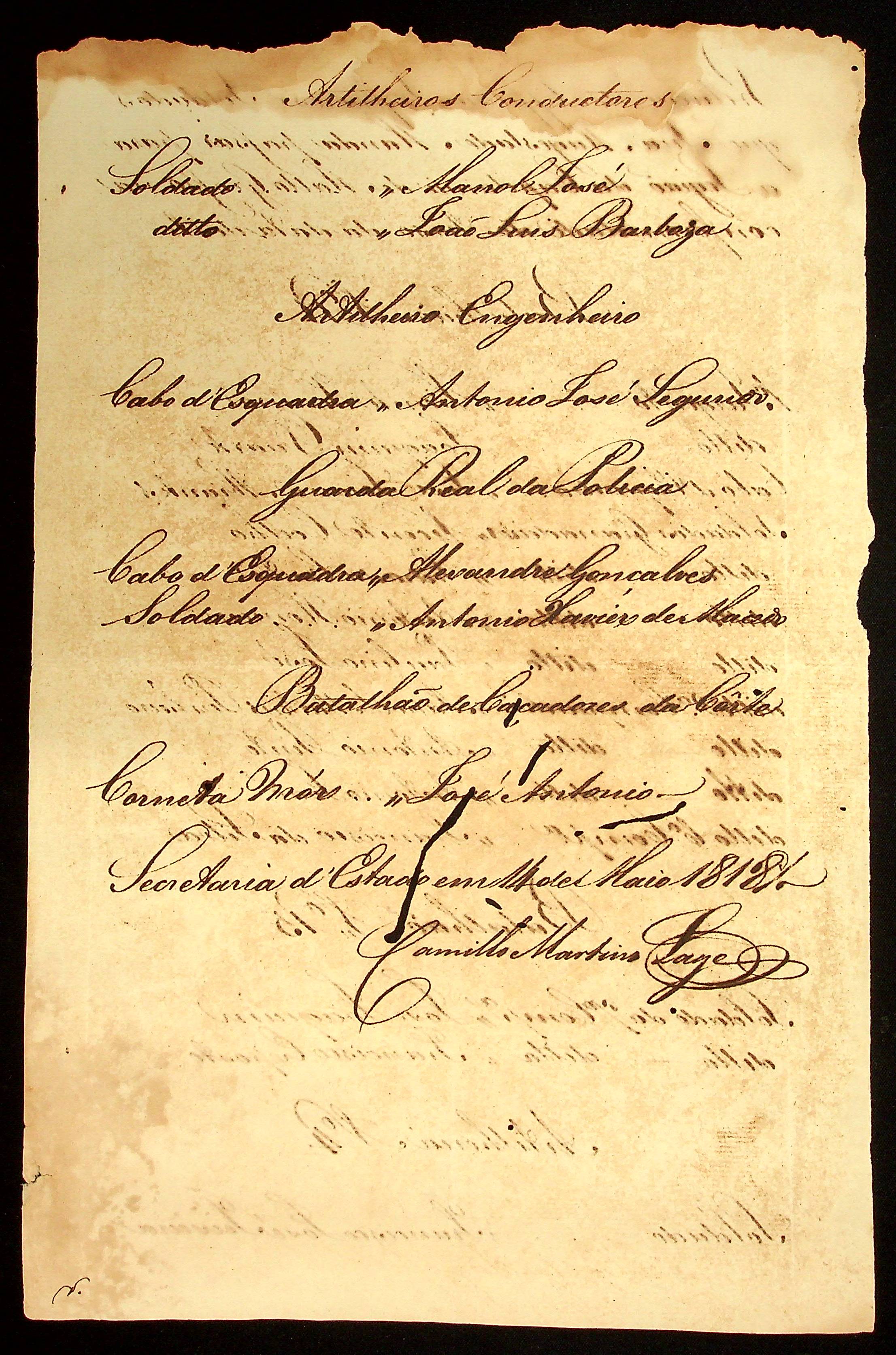 RELAÇÃO dos Oficiais Inferiores e Soldados que vão para a Legião da Capitania de Mato Grosso assinado por Camillo Martinho Large.
