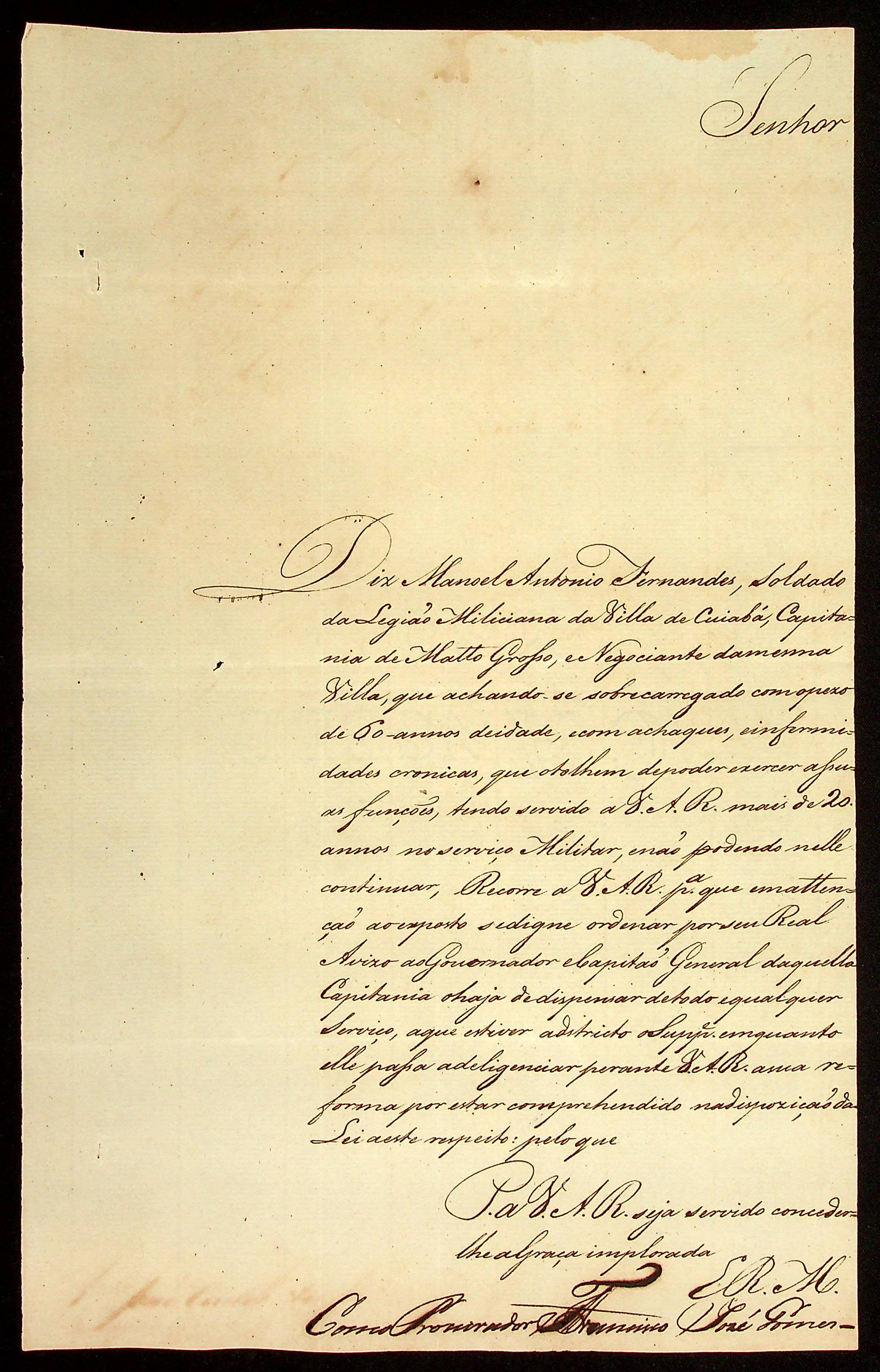 REQUERIMENTO do Soldado da Legião Miliciana da Vila do Cuiabá Manoel Antônio Fernandes ao Rei [D. João] assinado seu procurador Francisco José Gomes ao Rei.