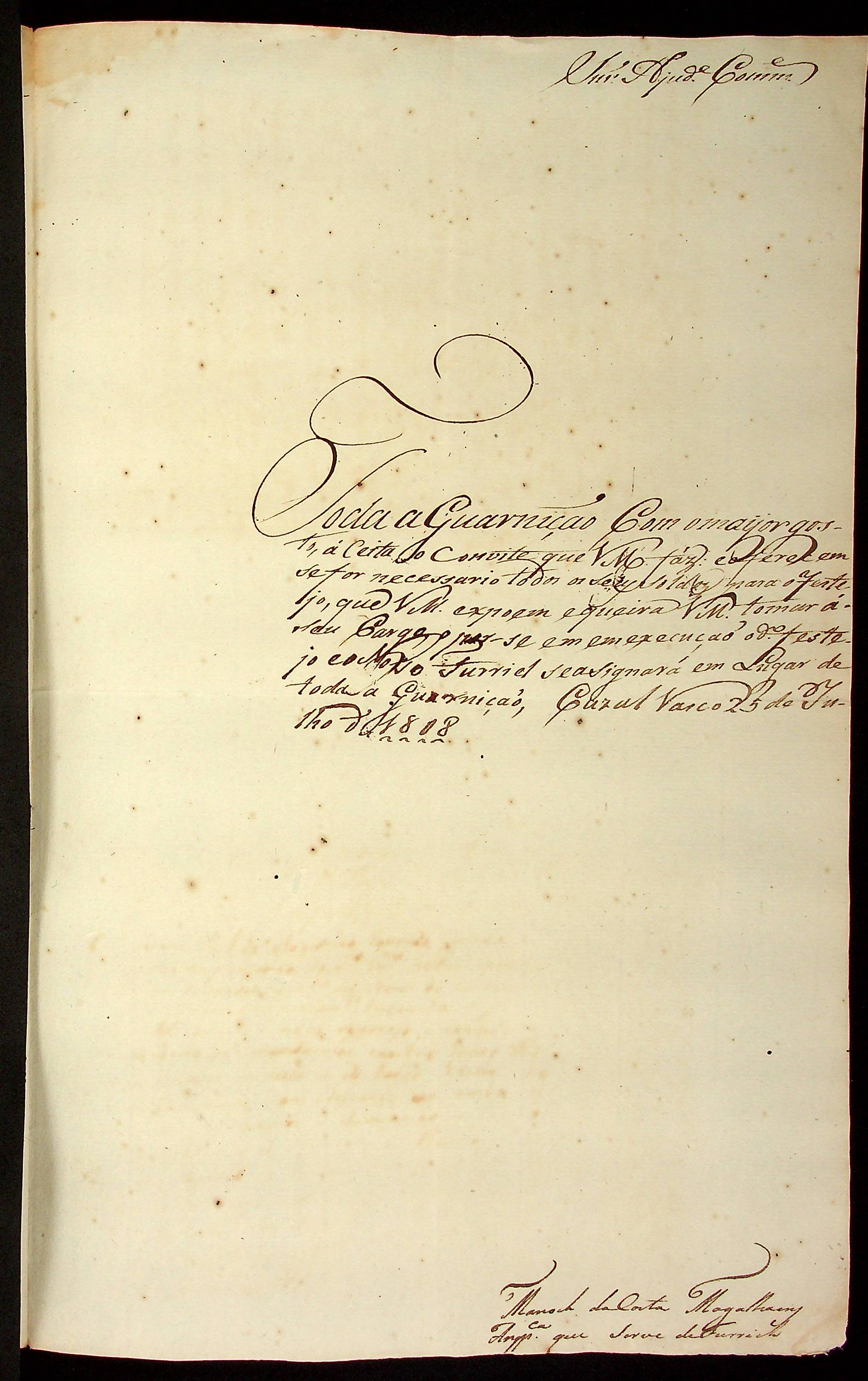 REQUERIMENTO do Anspeçada da Companhia de Dragões e que serve de Furriel no Destacamento de Casalvasco Manoel da Costa Magalhães ao Ajudante e Comandante […].