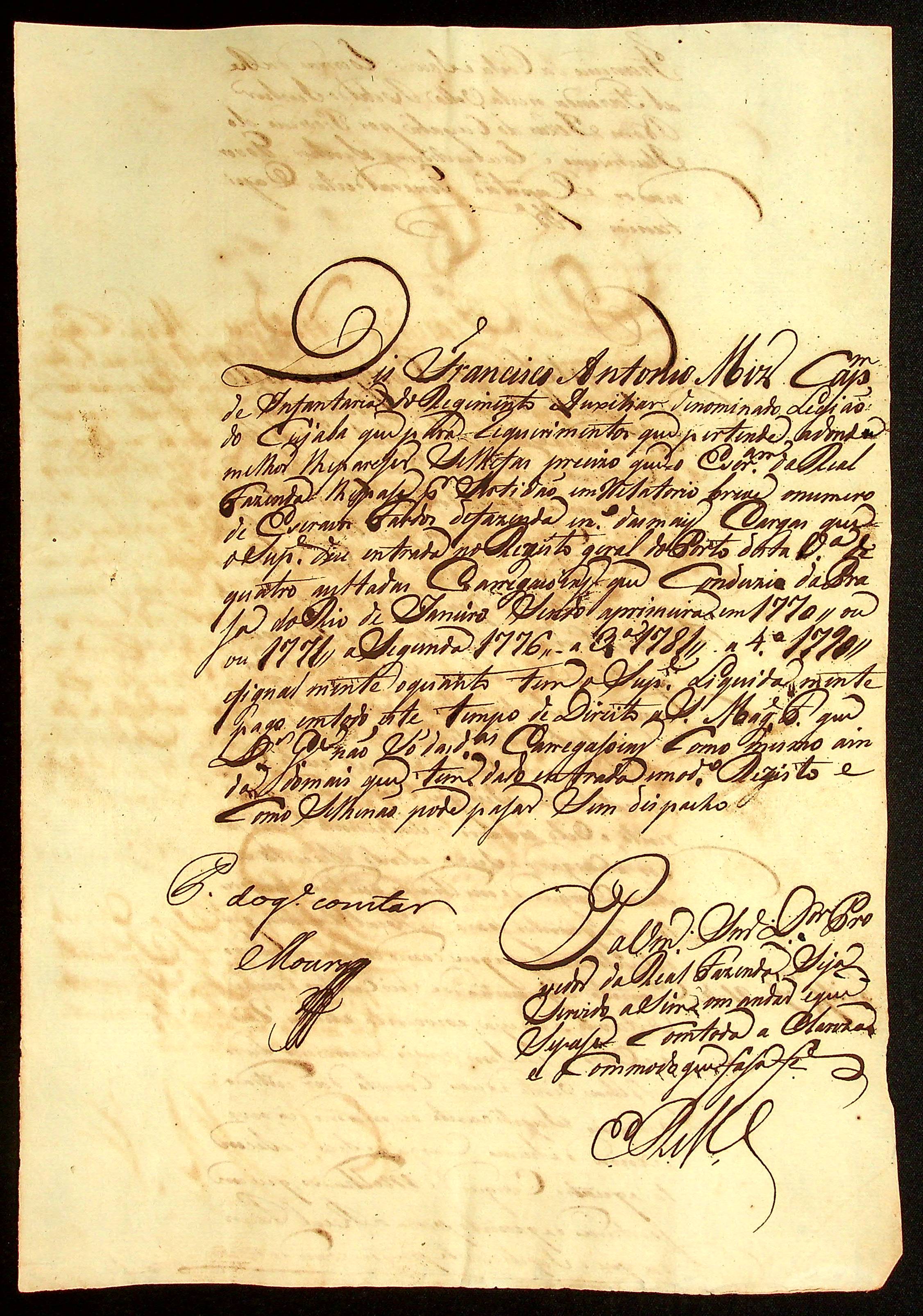 REQUERIMENTO do Capitão das Companhias de Infantaria do Regimento Auxiliar de Voluntários da Legião do Cuiabá Francisco Antônio Martins.
