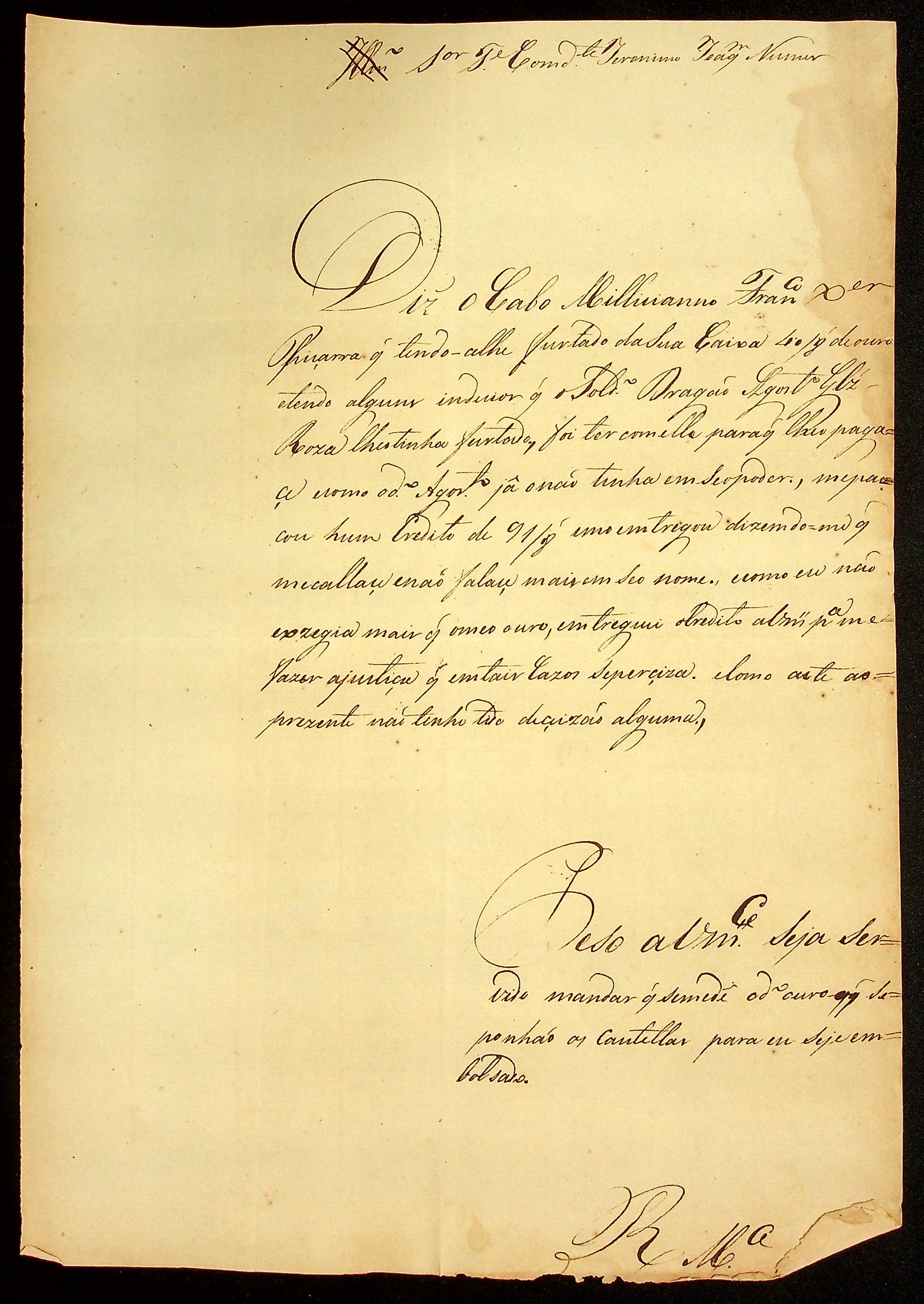 REQUERIMENTO do Cabo Miliciano Francisco Xavier Piçarra ao Tenente Comandante Jerônimo Joaquim Nunes.