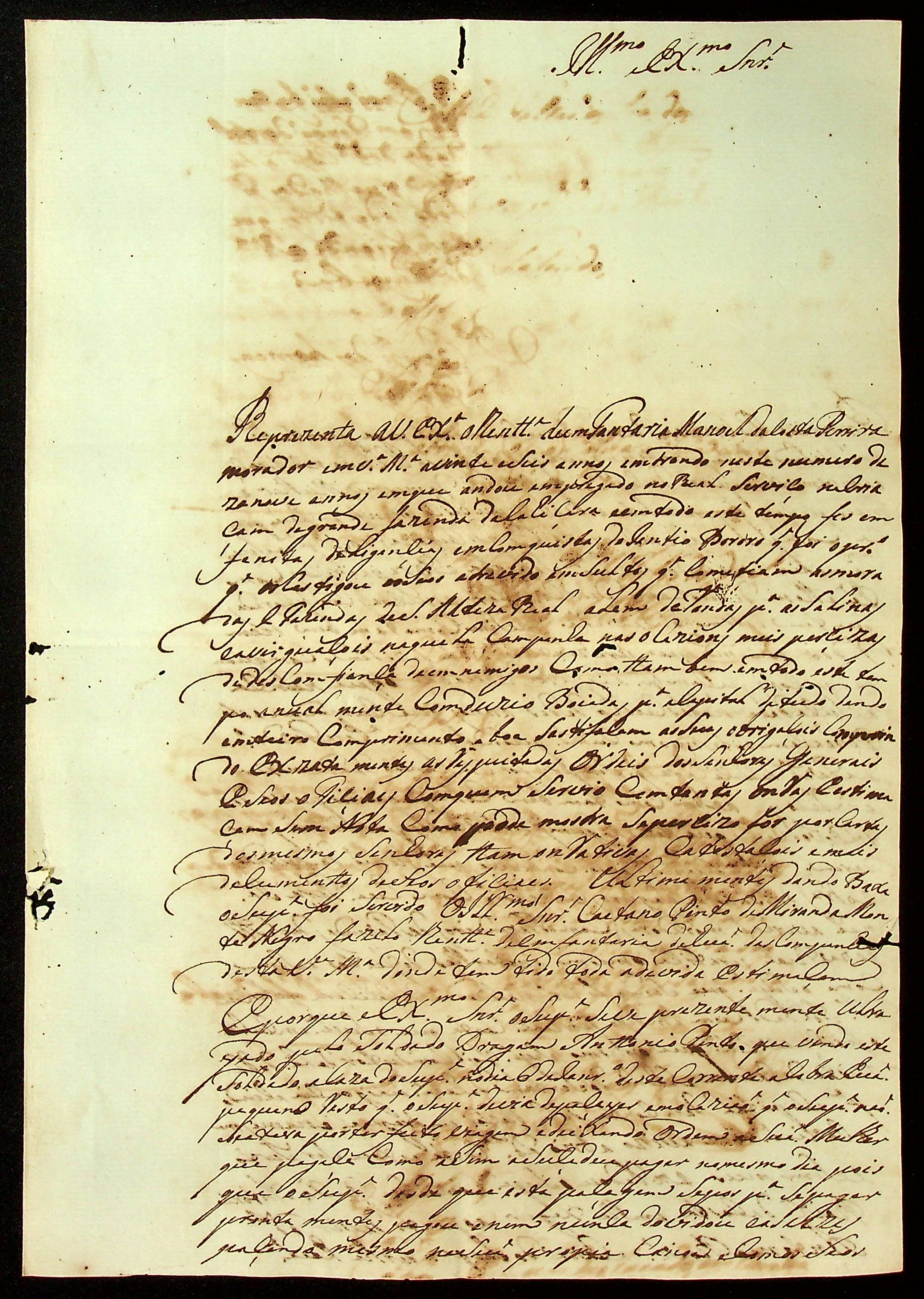 REPRESENTAÇÃO do Tenente de Infantaria Manoel da Costa Pereira ao [Governador e Capitão-General da Capitania de Mato Grosso] Manoel Carlos de Abreu e Menezes.