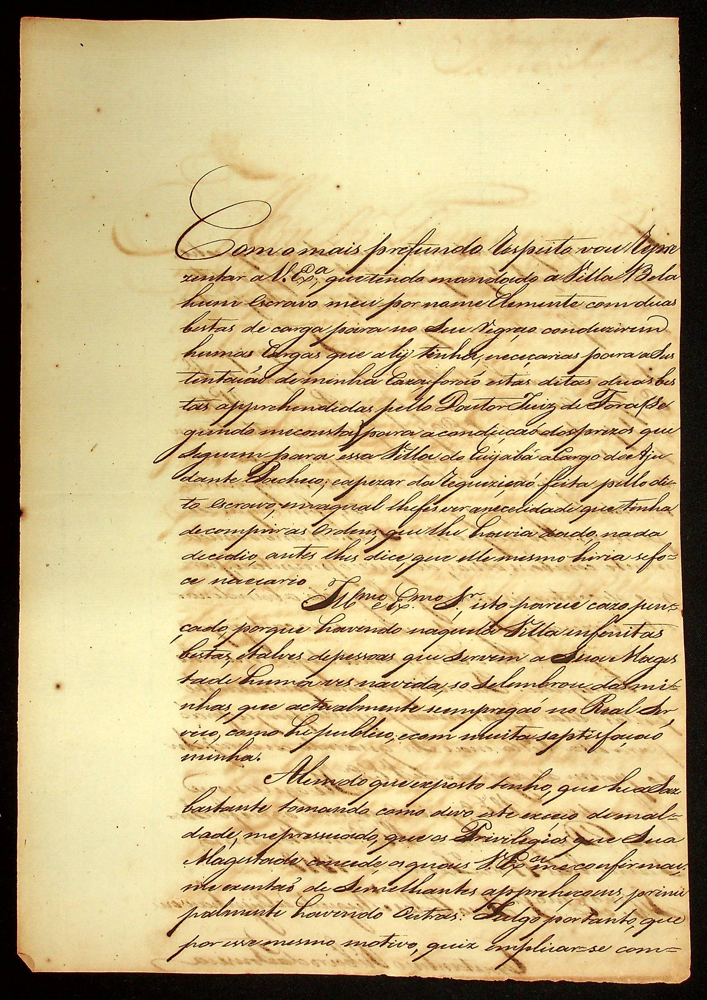 REPRESENTAÇÃO de Constantino Ribeiro da Fonseca ao [Governador e Capitão-General da Capitania de Mato Grosso] João Carlos Augusto d’Oeynhausen e Gravenberg.