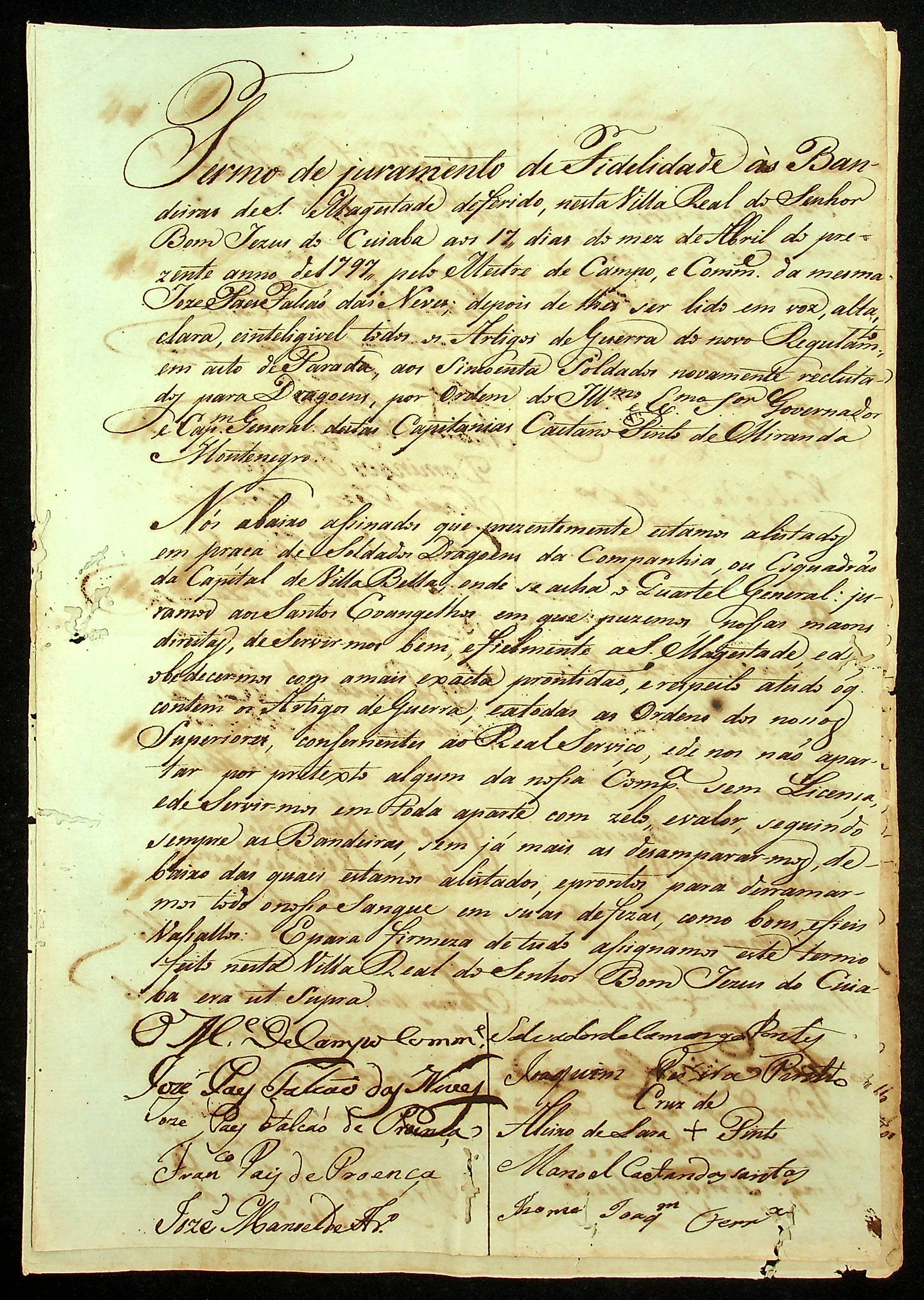 TERMO de Juramento de fidelidade às bandeiras de Sua Majestade deferido nesta Vila Real do Bom Jesus de Cuiabá pelo Mestre de Campo e Comandante das mesmas José Paes Falcão das Neves.
