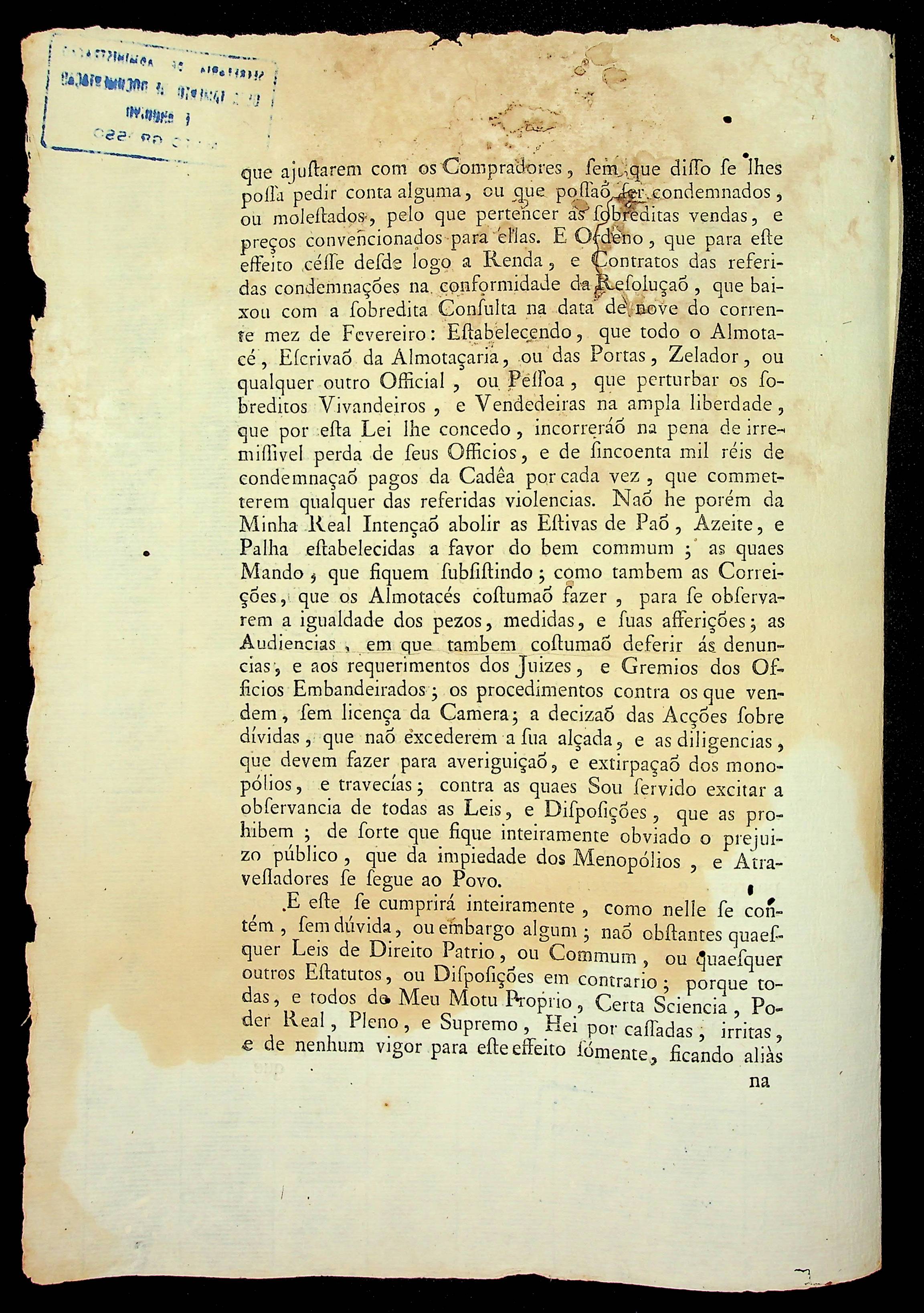 ALVARÁ expedido pelo Rei em que manda abolir todas as taxas e condenações que dela provierem e em todos seus viveres, que se venderem na cidade de Lisboa e seu termo, e igualmente as rendas, e contratos das referidas condenações e suas restrições.