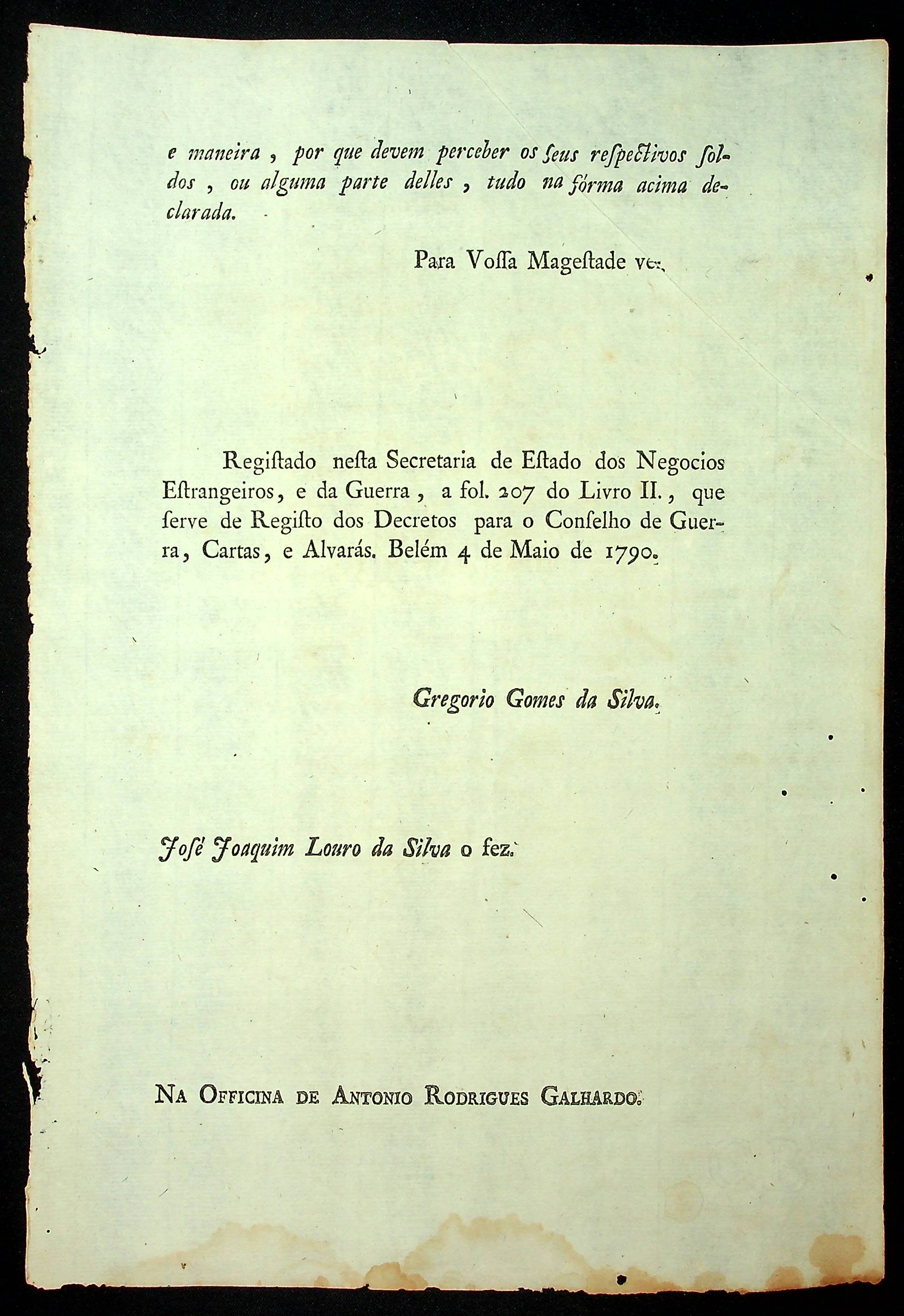 ALVARÁ da Rainha [D. Maria I] determina que aos oficiais de seus exércitos, que por qualquer Acontecimentos e se acharem presos, não sejam absolutamente privados dos soldos, e demais procedimentos.