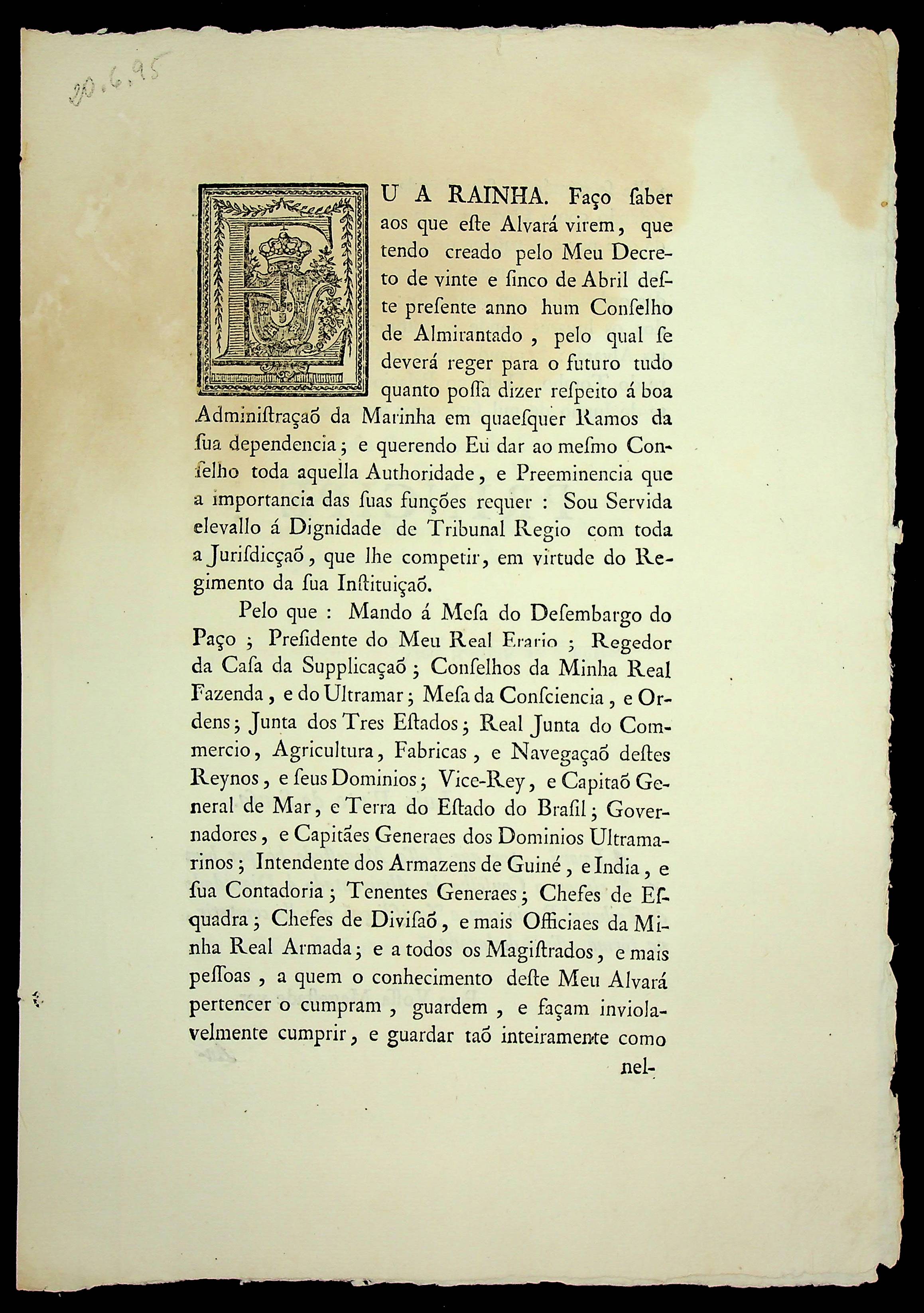 ALVARÁ expedido pela Rainha Dona Maria, para o funcionamento do Conselho de Almirantado, de acordo com o Decreto do dia 25/04 deste presente ano. Elevação do Conselho de Almirantado á categoria de Tribunal Régio, com toda sua Jurisdição.