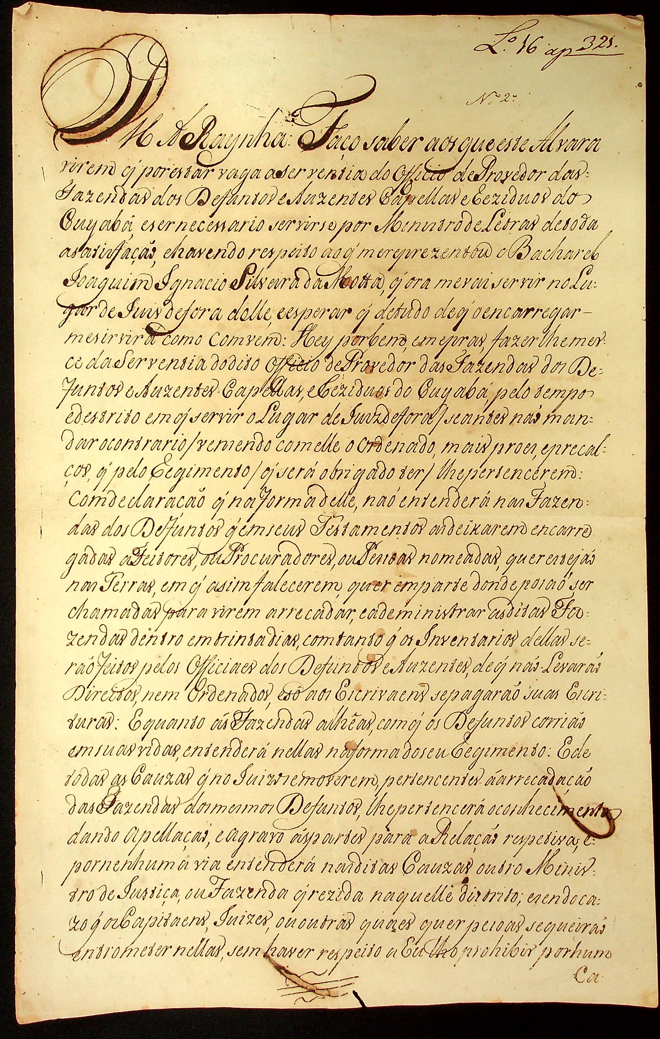ALVARÁ expedido pela Rainha [Dona Maria] que faz mercê a Joaquim Ignácio Silveira da Motta para a serventia de Provedor das Fazendas Defuntos e Ausentes Capelas e Resíduos do Cuiabá.