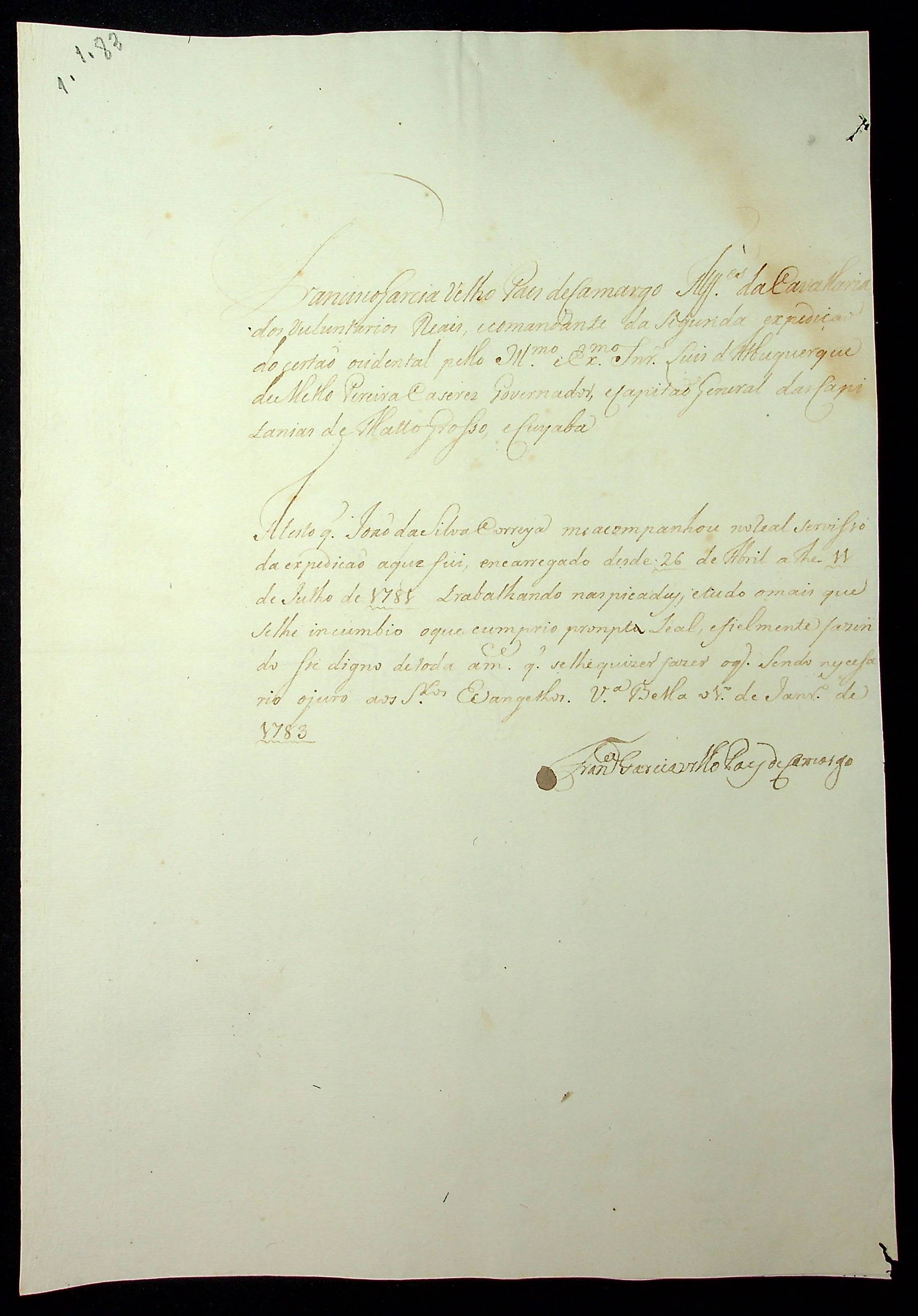 ATESTADO (conjunto) passado pelo Alferes da Cavalaria dos Voluntários Reais e Comandante da Segunda Expedição do Sertão Ocidental Francisco Garcia Velho Paes de Camargo, informando que João da Silva Correia, José Ramos e João de Souza, o acompanhou na expedição do Sertão Ocidental.