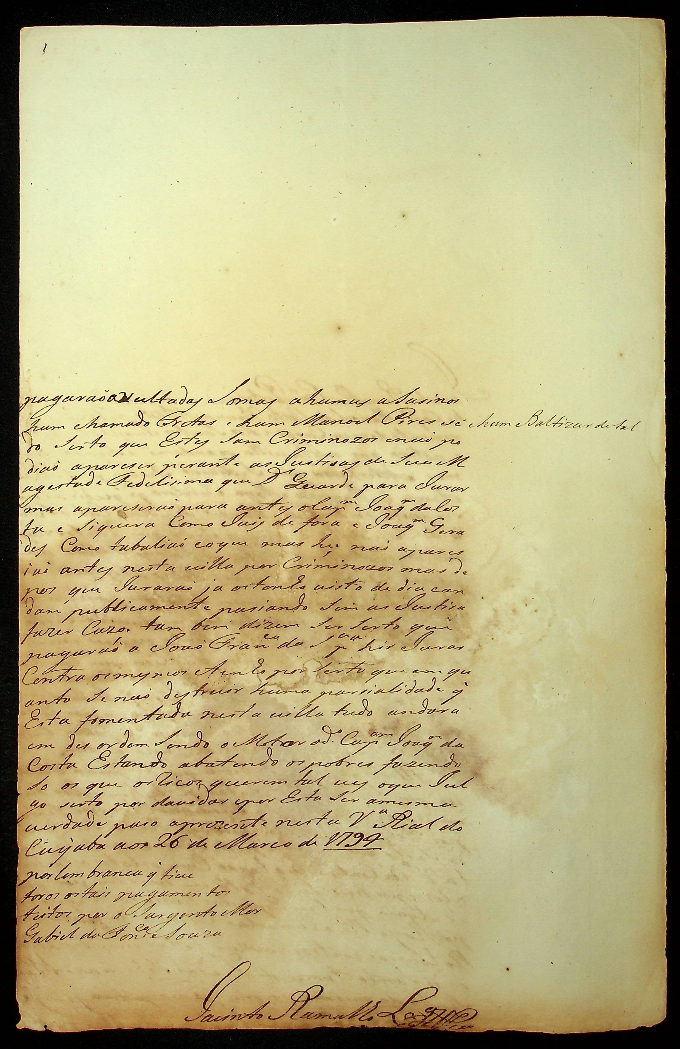 ATESTADO Porta Bandeira de Caçadores Jacinto Ramalho Lisboa, ao [Governador e Capitão General da Capitania de Mato Grosso João de Albuquerque de Mello Pereira e Cáceres].