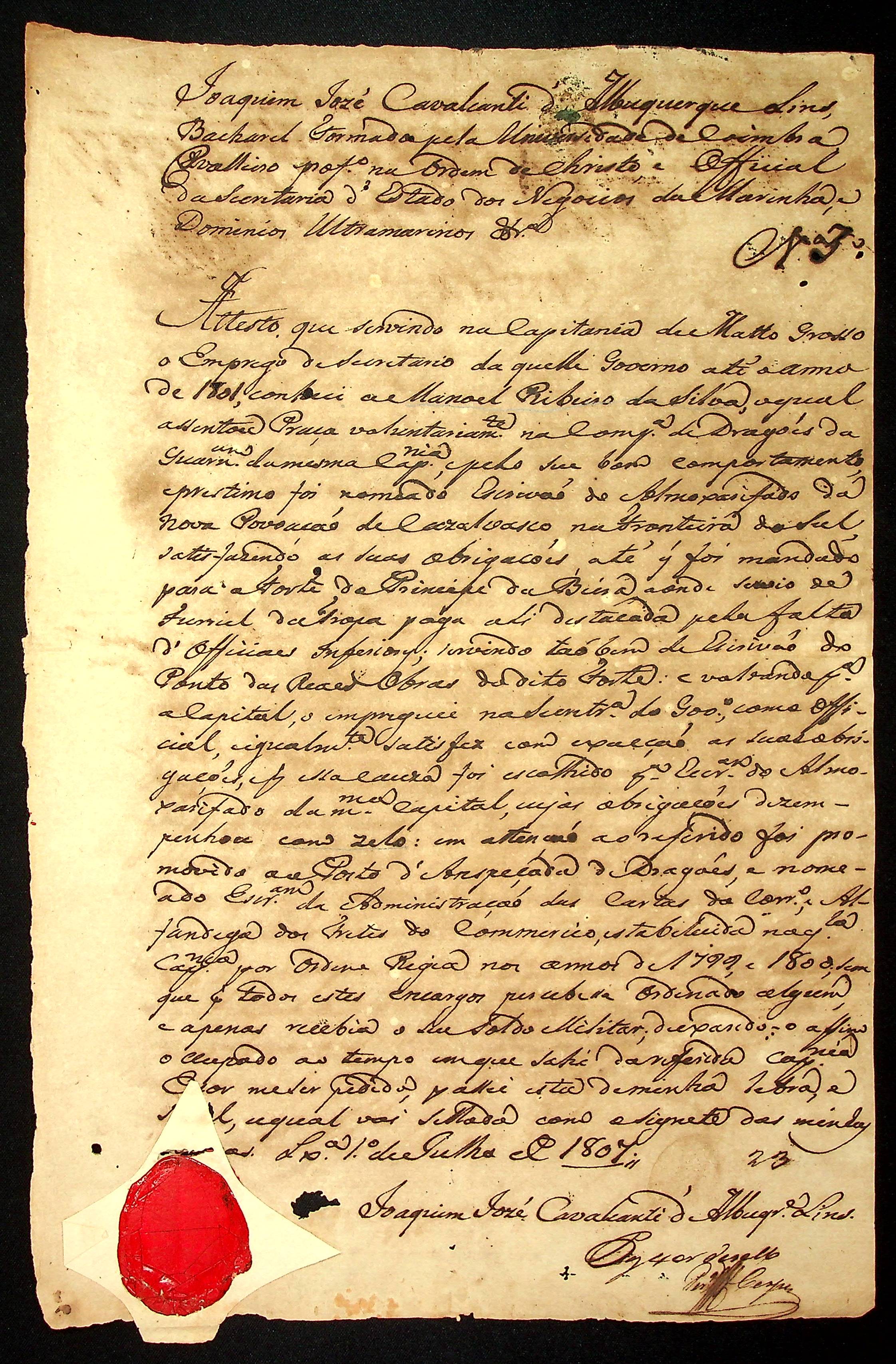 ATESTADO de Joaquim José Cavalcanti de Albuquerque Lins, Oficial da secretaria de Estado dos negócios da Marinha e Domínios Ultramarino, atestando o bom comportamento e ocupações de Manoel Ribeiro da Silva.