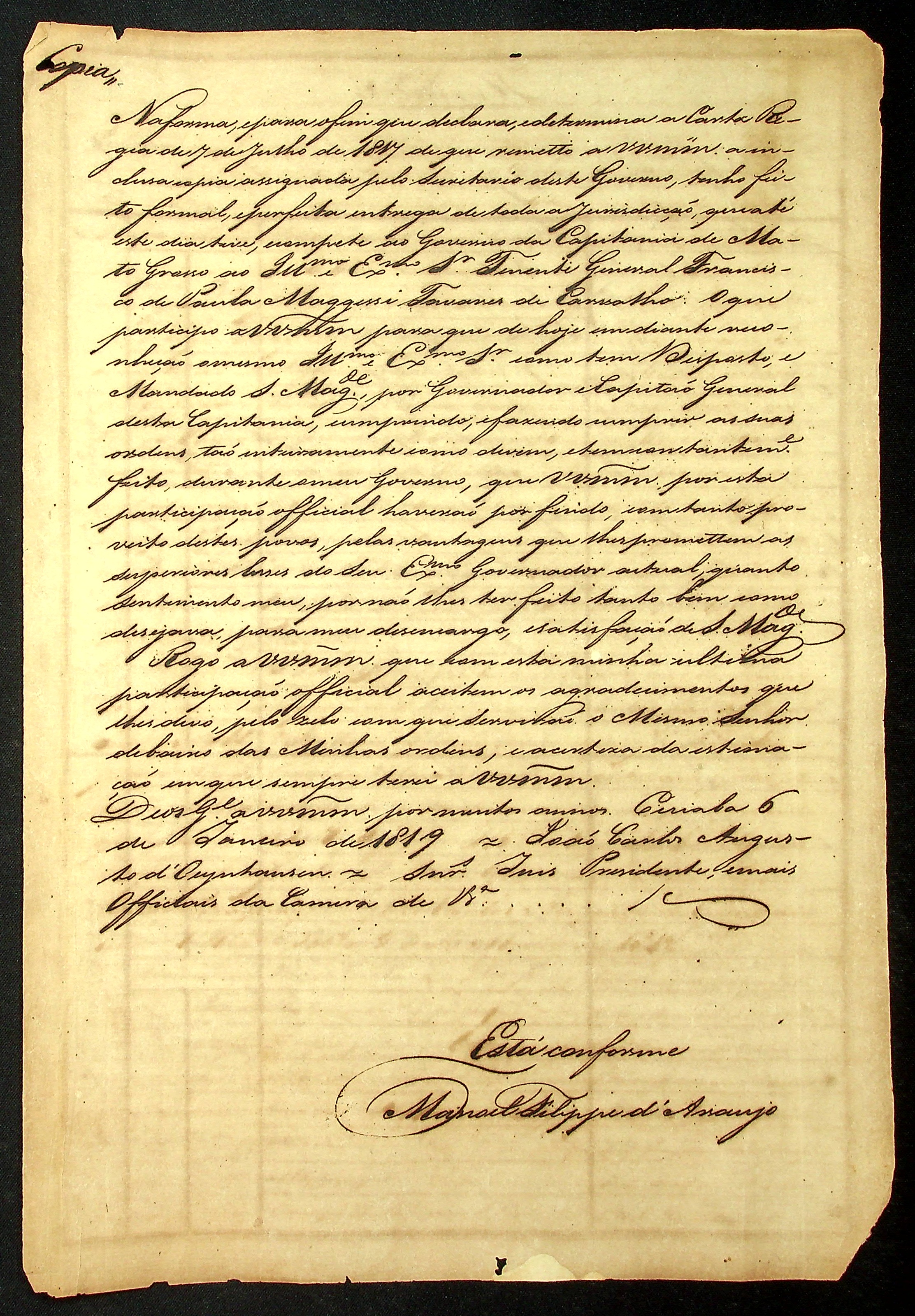 AVISO (cópia) do [Governador e Capitão General da Capitania de Mato Grosso] João Carlos Augusto de Oeynhausen e Gravemberg ao Juíz Presidente e mais oficiais da Câmara.