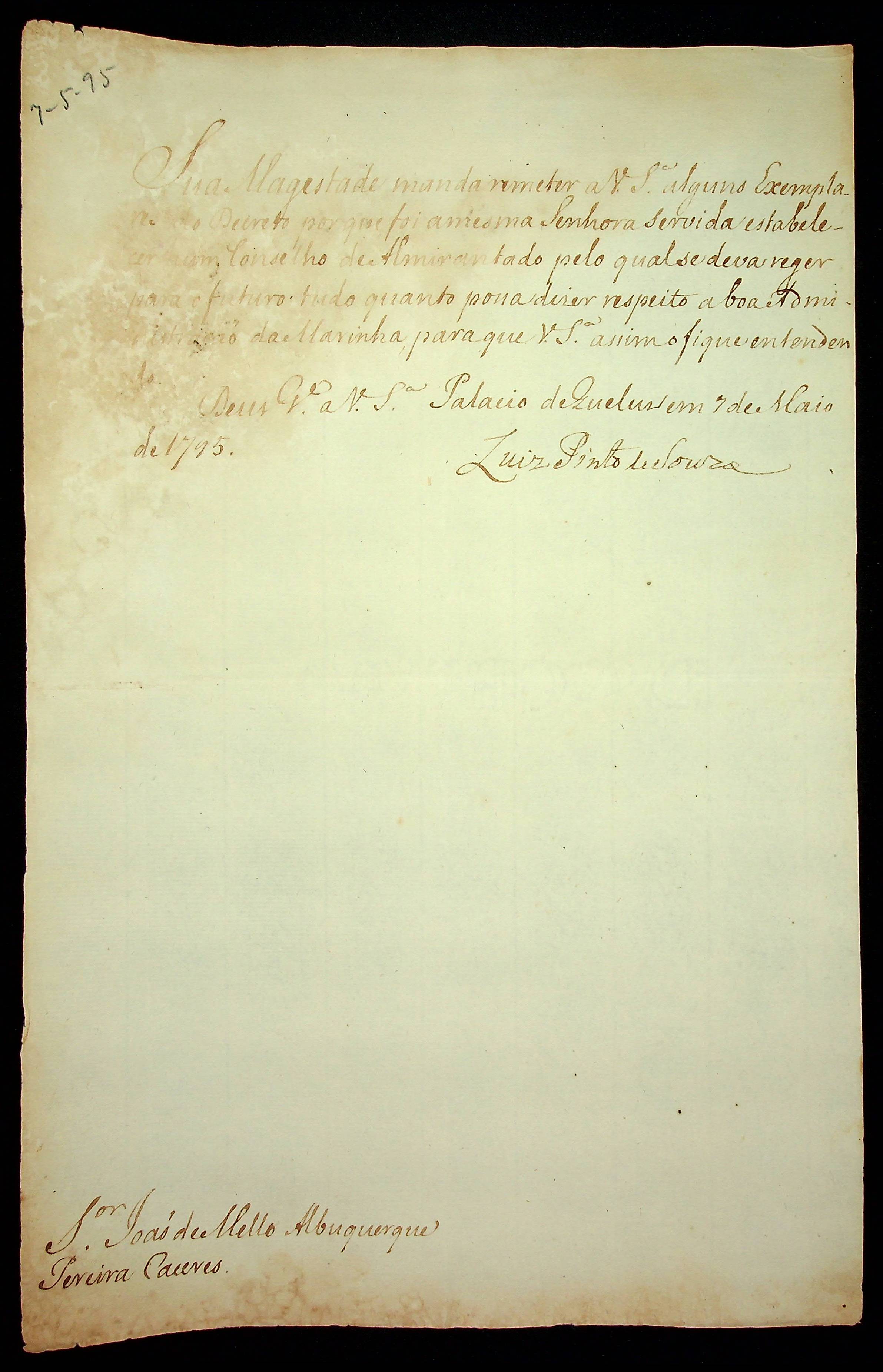 AVISO RÉGIO de Luiz Pinto de Souza ao [Governador e Capitão General da Capitania de Mato Grosso] João de Albuquerque de Melo Pereira e Cáceres.