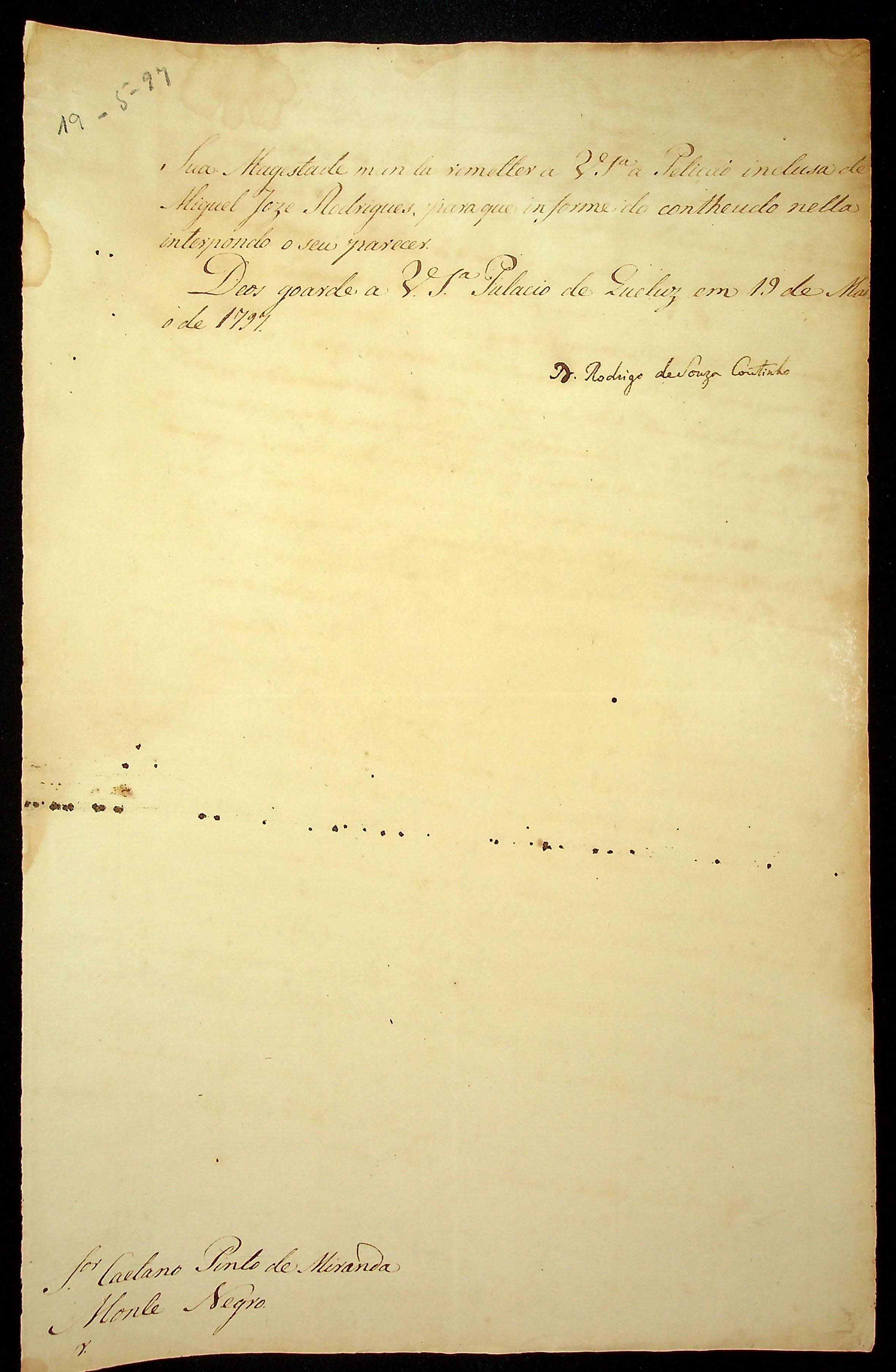 AVISO RÉGIO de D. Rodrigo de Souza Coutinho ao [Governador e Capitão General da Capitania de Mato Grosso] Caetano Pinto de Miranda e Montenegro.