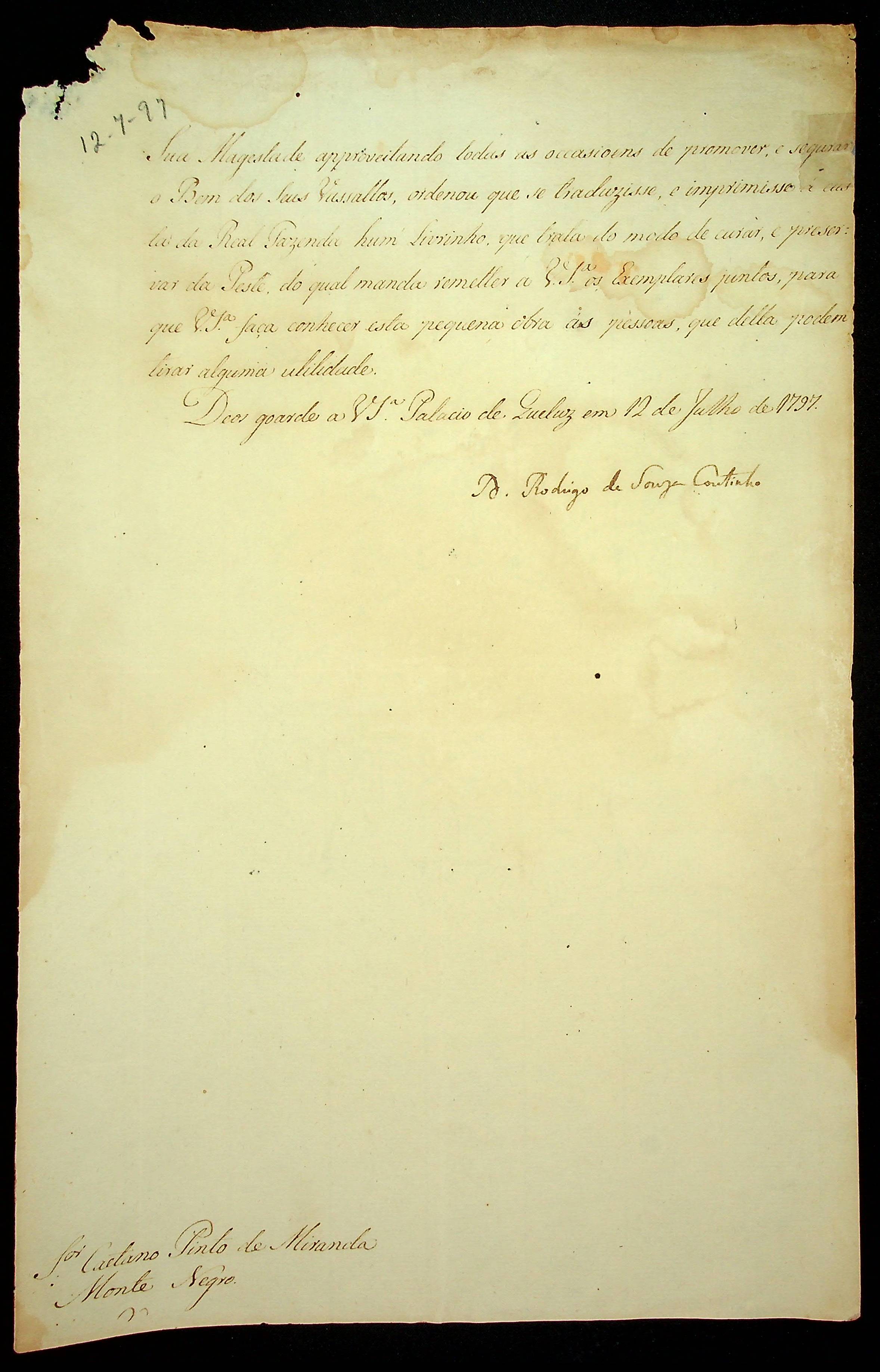 AVISO RÉGIO de D. Rodrigo de Souza Coutinho ao [Governador e Capitão General da Capitania de Mato Grosso] Caetano Pinto de Miranda e Montenegro.