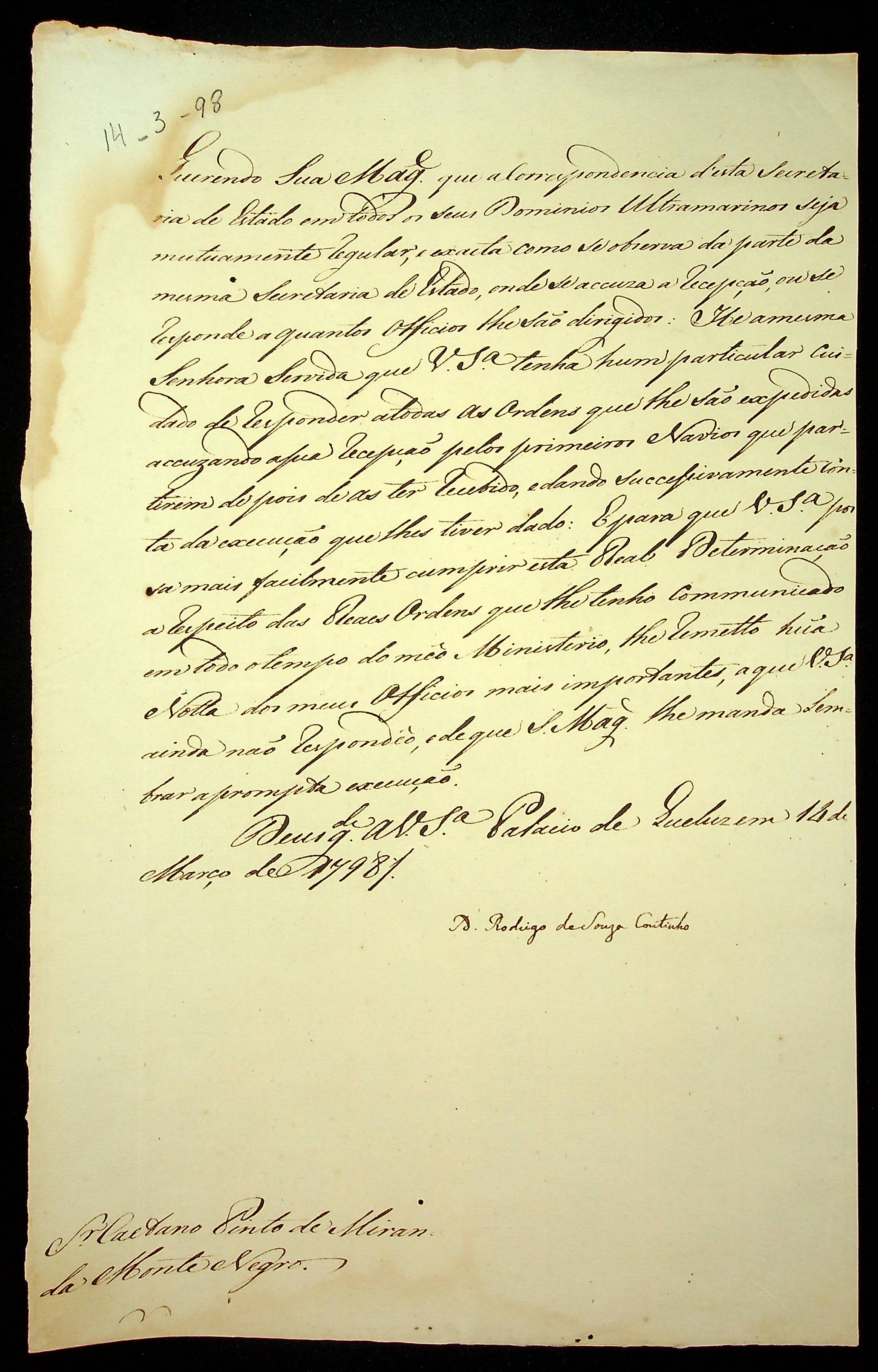 AVISO RÉGIO de D. Rodrigo de Souza Coutinho ao [Governador e Capitão General da Capitania de Mato Grosso] Caetano Pinto de Miranda e Montenegro.