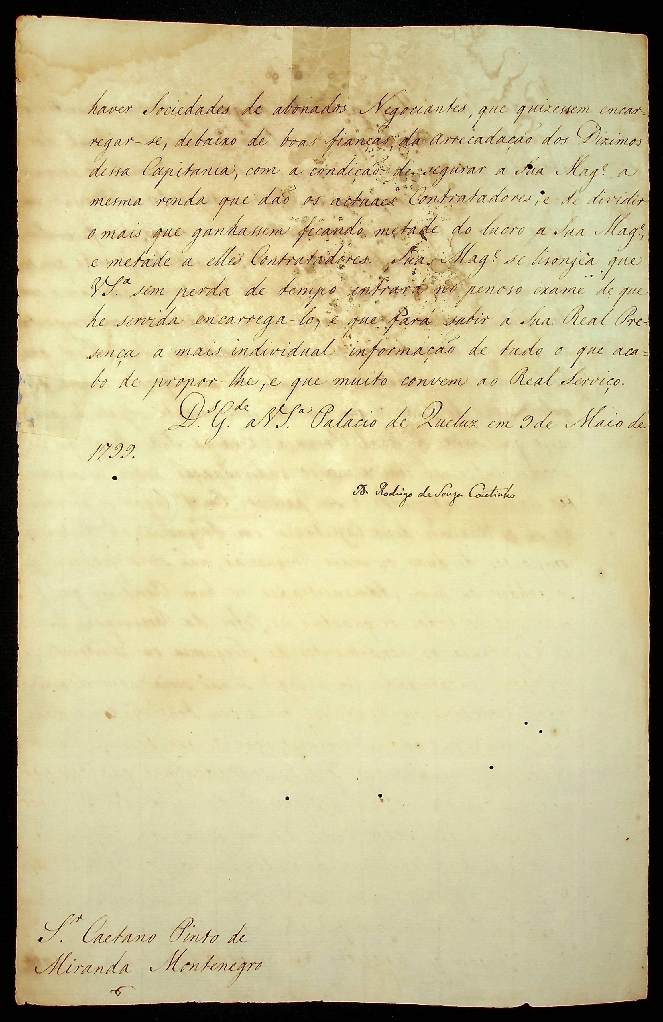 AVISO RÉGIO de D. Rodrigo de Souza Coutinho ao [Governador e Capitão General da Capitania de Mato Grosso] Caetano Pinto de Miranda e Montenegro.
