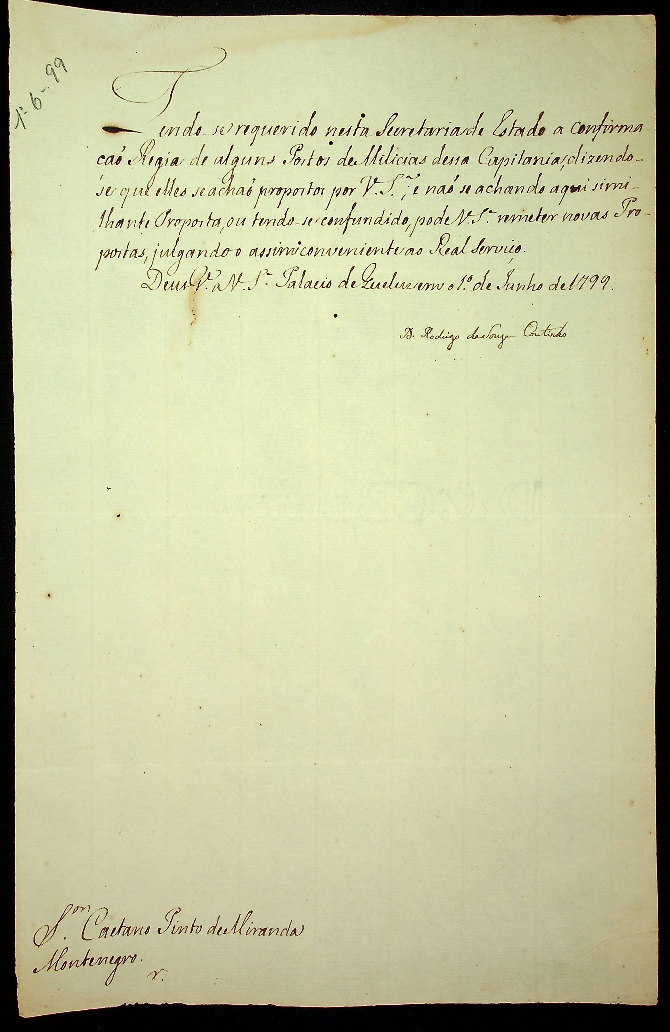 AVISO RÉGIO de D. Rodrigo de Souza Coutinho ao [Governador e Capitão General da Capitania de Mato Grosso] Caetano Pinto de Miranda e Montenegro.